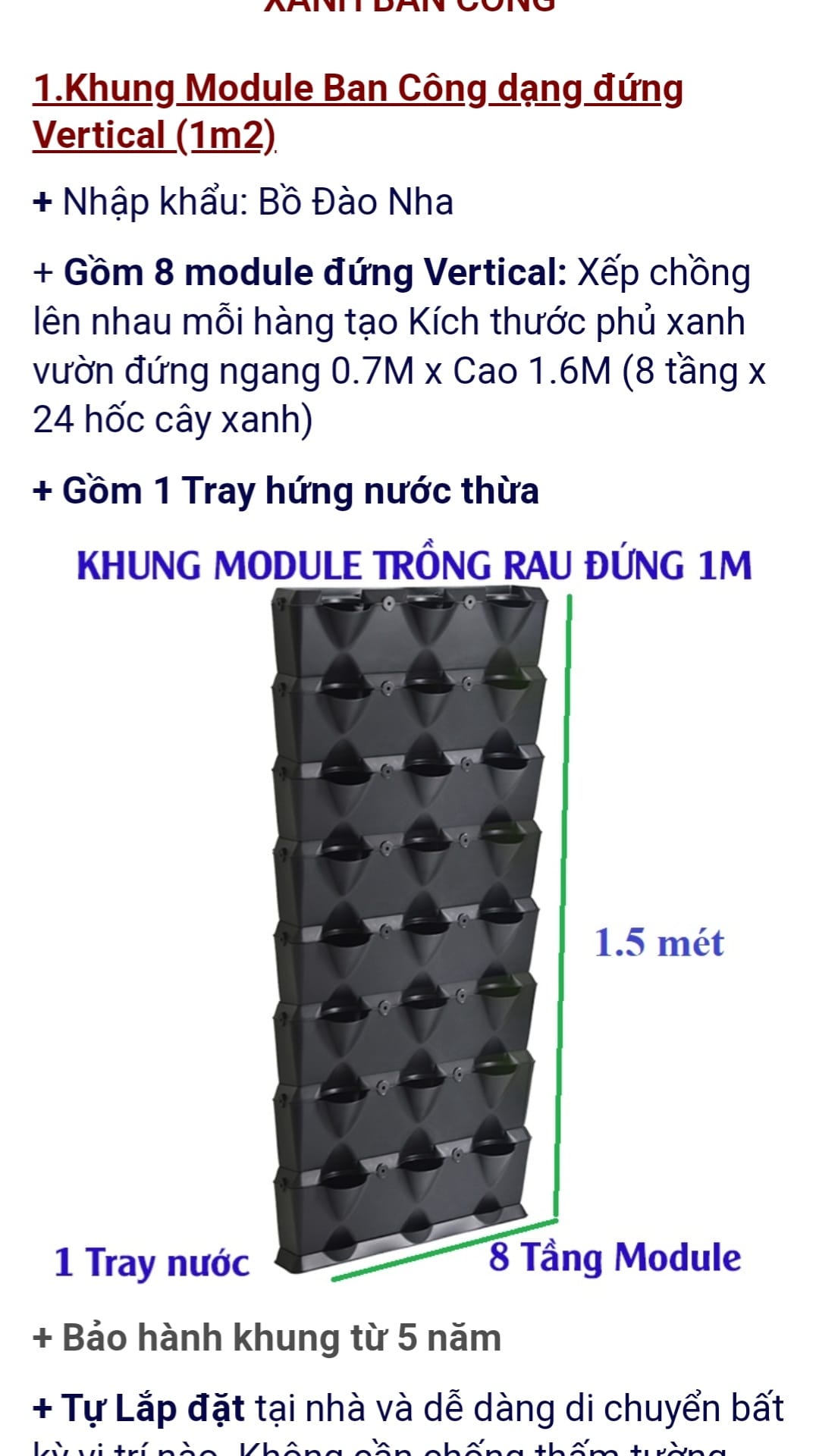 Chậu trồng rau Đứng nhập khẩu cực kỳ dễ lắp đặt. Bạn tưởng tượng đến TRÒ CHƠI GHÉP HÌNH CON TRẺ, bạn sẽ biết "những gì nên làm cho vườn rau đứng của mìh"? Nhờ vào các chậu Module dễ dàng TỰ LẮP ĐẶT tại nhà, dễ chăm sóc, dễ di chuyển và cả vẻ đẹp sang trọng, hợp lý… nên luôn được mọi người quan tâm.