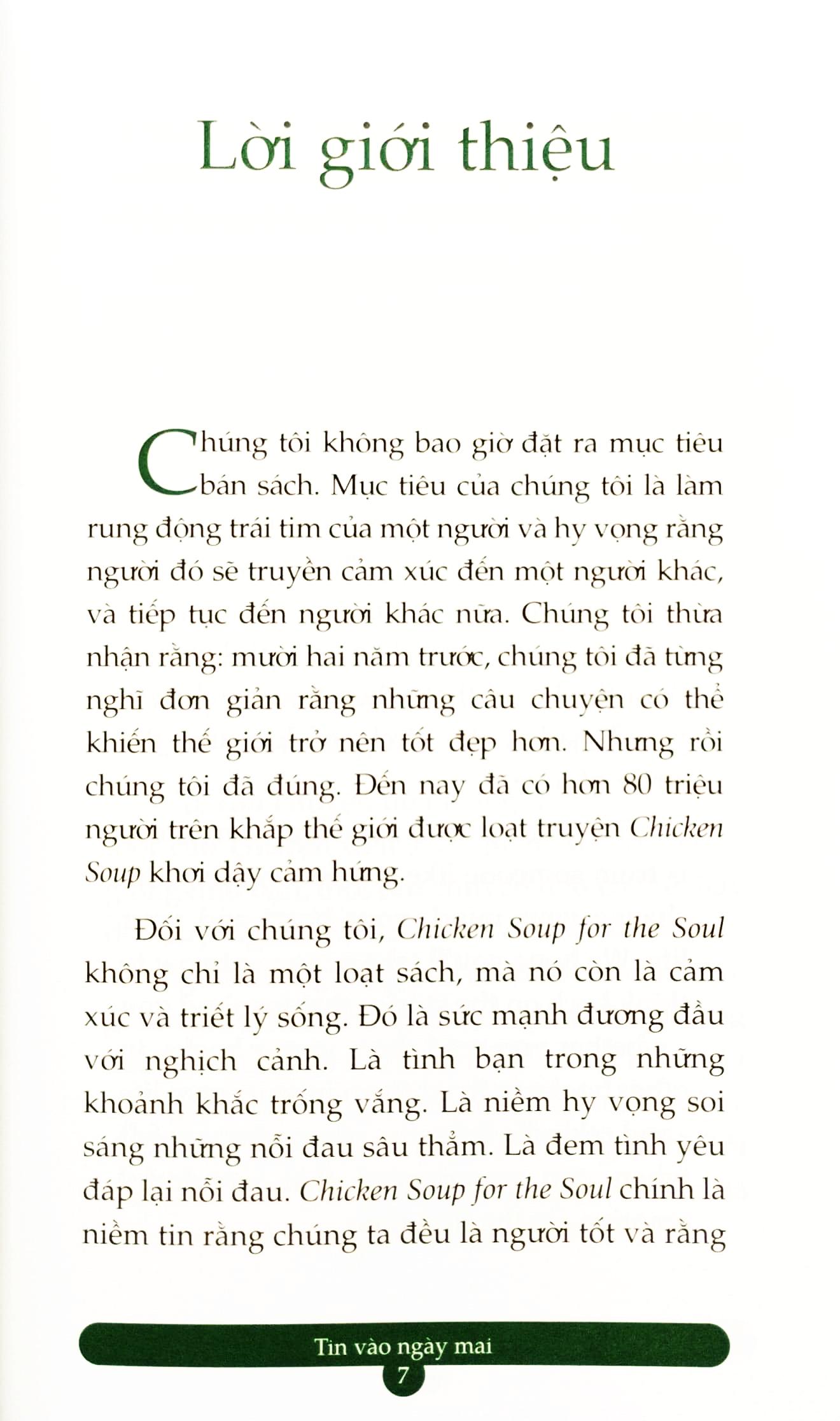 Mong rằng bạn sẽ dành ra chút thời gian nghĩ lại về những câu chuyện đã tác động tích cực đến bạn – dù bạn đọc trong sách của chúng tôi hay trong những cuốn sách khác, hay chính bạn gặp phải trong cuộc sống – và hồi tưởng lại cảm giác phấn khích tuyệt vời bạn đã có khi lần đầu tiên cảm nhận. Những câu chuyện trong Chicken Soup for the Soul Stories for a Better World – Tin vào ngày mai truyền cảm hứng và chia sẻ niềm vui trong cuộc sống, về niềm tin vào những điều tốt đẹp, bất kể những khó khăn trước mắt.