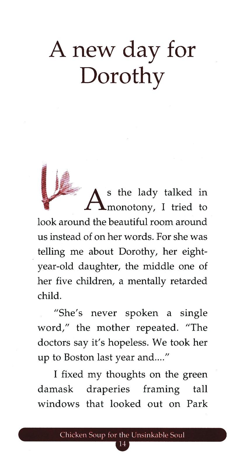 Tiếp đến, Chicken Soup for the Unsinkable Soul cũng sẽ giúp bạn nhận ra giá trị đích thực của những tấm lòng biết sẻ chia. Chúng tôi hy vọng những mẩu chuyện nhỏ ấy sẽ khuyến khích bạn tìm đến mọi người khi bạn cần được giúp đỡ cũng như giúp bạn sẽ mở rộng trái tim m.ình với những ai đang cần tựa đầu vào bờ vai bạn. Và cuối cùng, có rất nhiều mẩu chuyện sẽ chứng minh cho chúng ta thấy rằng trở ngại cũng chính là người thầy tốt nhất của mỗi người. Chúng có thể khơi dậy sức mạnh tiềm tàng của ta, nhắc chúng ta nhớ về những khía cạnh cần hoàn thiện, chỉ dẫn chúng ta cách giữ vững lòng tin vào chính m.ình và hướng dẫn ta cách chấp nhận những việc không thuộc phạm vi kiểm soát của bản thân.