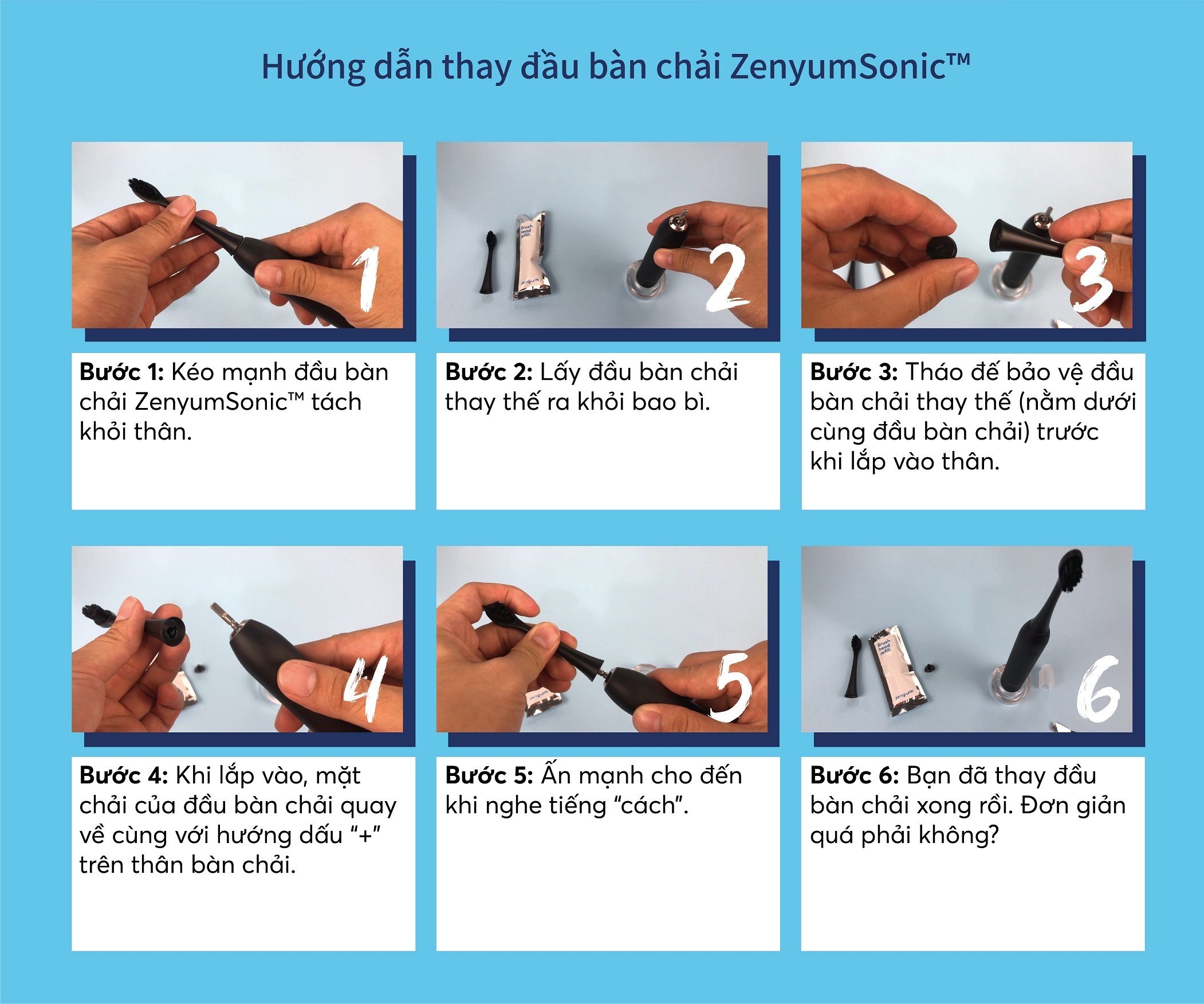 LƯU Ý: Quý khách vui lòng check kỹ toàn bộ sản phẩm nhận được và quay video toàn bộ quá trình bóc hàng. Shop chỉ giải quyết khi có video. Shop xin cảm ơn!   Các nha sĩ khuyên bạn nên thay đầu bàn chải mỗi 3 tháng/lần để duy trì hiệu quả làm sạch và đảm bảo vệ sinh   Đầu bàn chải thay thế Zenyum Sonic chỉ tương thích với bàn chải điện ZenyumSonic, không tương thích với bàn chải điện Zenyum Sonic Spark và bàn chải điện Zenyum Sonic Go   Thông tin sản phẩm Đầu bàn chải thay thế đánh răng điện ZenyumSonic 2.0: Thương hiệu: Zenyum Công nghệ: Singapore Xuất xứ: Trung Quốc Chất liệu: nhựa TPE, sợi Dupont   Khuyến nghị sử dụng sản phẩm cho trẻ em từ 12 tuổi trở lên   Đặc điểm vượt trội của sản phẩm: Sợi lông chải Dupont mềm mại loại bỏ mảng bám tốt hơn, đồng thời đem lại sự êm ái cho răng và nướu Mặt chải lưỡi giúp bạn làm sạch lưỡi trong khi đánh răng. Thiết kế cổ đầu chải linh hoạt giúp giảm áp lực lên nướu.   Cách sử dụng: Để tháo đầu bàn chải cũ, kéo đầu bàn chải ra khỏi thân bàn chải. Tháo nút chặn màu đen (nếu có) ở đáy đầu bàn chải mới. Căn chỉnh đầu bàn chải mới với trục kim loại, đảm bảo lông bàn chải hướng về phía trước. Ấn mạnh xuống cho đến khi đầu bàn chải được gắn chặt. Một khe hở nhỏ giữa đầu bàn chải và thân máy là hoàn toàn bình thường.   Mẹo sử dụng: Thay đầu bàn chải mỗi 3 tháng/lần, hoặc bất cứ khi nào lông bàn chải bị xòe. Bảo quản nơi khô ráo và sạch sẽ. Tránh ánh nắng trực tiếp.   Chế độ bảo hành: Sản phẩm được bảo hành lỗi 1 đổi 1 trong 1 năm đối với các lỗi kỹ thuật điện, không bảo hành vấn đề bong tróc,các lỗi chủ quan trong quá trình sử dụng Cách thức liên hệ bảo hành: INBOX CHO SHOP   ZENYUM cam kết: ZENYUM cam kết mang đến cho khách hàng sản phẩm chính hãng với chất lượng tốt nhất trong tầm giá ZENYUM cam kết chính sách bảo hành tốt nhất cho khách hàng   Cùng ZENYUM Sonic cải thiện thói quen chăm sóc răng miệng hiệu quả và sở hữu nụ cười trắng sáng rạng rỡ hơn mỗi ngày.   Hãy follow Zenyum để nhận ưu đãi/voucher nhé!