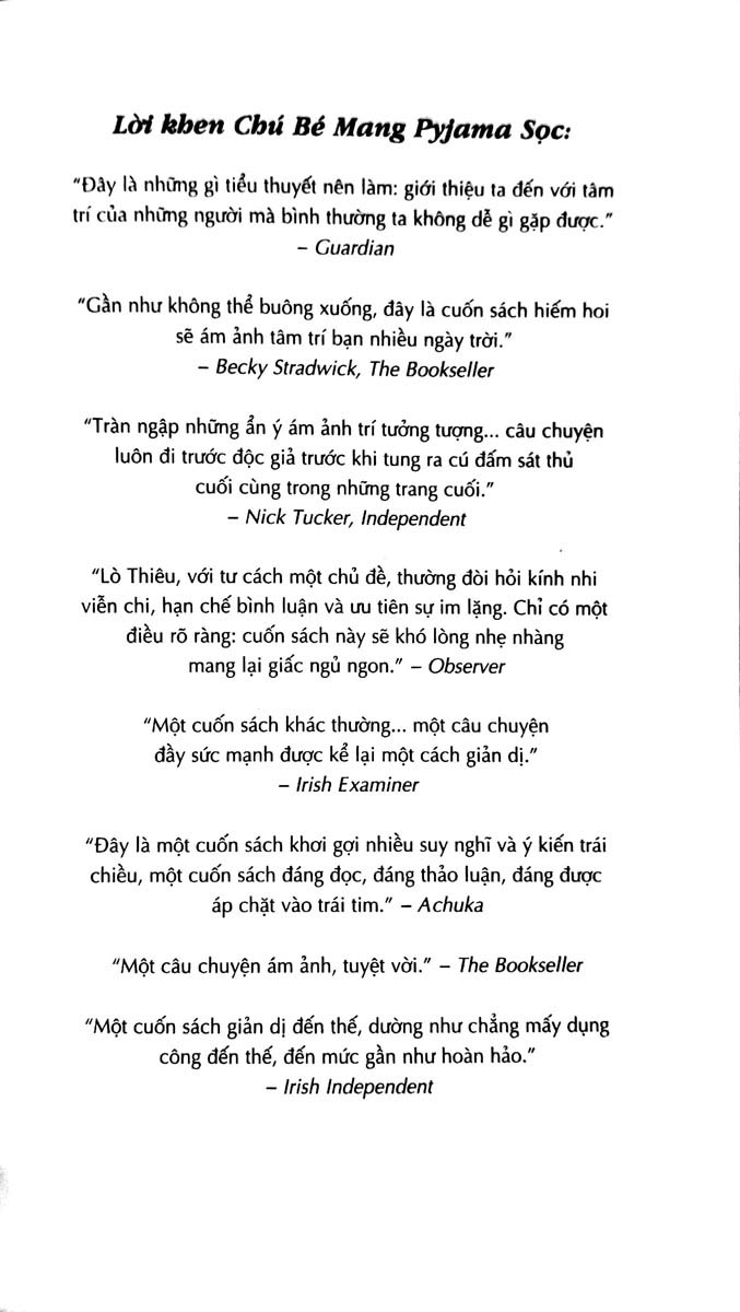 "Lò Thiêu, với tư cách một chủ đề, thường đòi hỏi kính nhi viễn chi, hạn chế bình luận và ưu tiên sự im lặng. Chỉ có một điều rõ ràng: cuốn sách này sẽ khó lòng nhẹ nhàng mang lại giấc ngủ ngon." - Observer