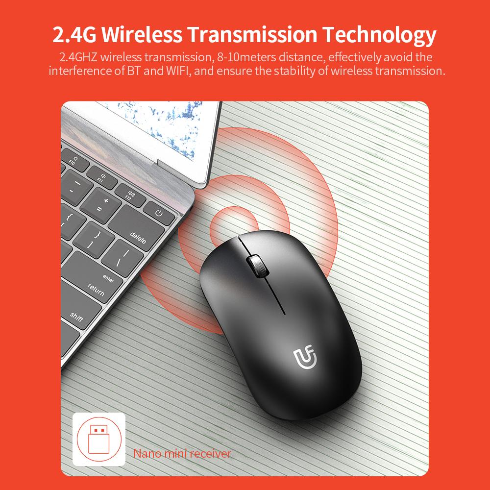 Features: 2.4G Wireless Transmission Technology 2.4GHZ wireless transmission, 8-10meters distance, effectively avoid the interference of BT and WIFI, and ensure the stability of wireless transmission. Low Decibel Keys The mouse has low-decibel buttons with a