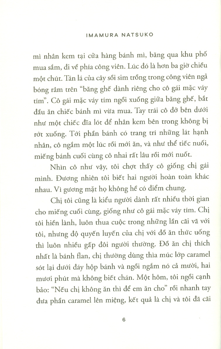 Khắc họa một người dẫn chuyện có phần ngờ nghệch và kỳ dị là một việc hết sức khó khăn nhưng nhờ sự diện hiện của “cô gái mặc váy tím” mà những điều lẩn khuất trong bóng tối về nhân vật “tôi” lại càng trở nên có chiều sâu. Khi đọc đến đoạn cuối, khi “tôi” đang định ăn bánh mì kem thì bị một đứa bé vỗ vào vai, nỗi buồn như muốn phát điên choán lấy lồng ngực tôi. Tác giả Imamura quả nhiên rất có tài năng trong việc khắc họa sống động những con người đi lệch quỹ đạo thông thường của con người. – Ogawa Yoko