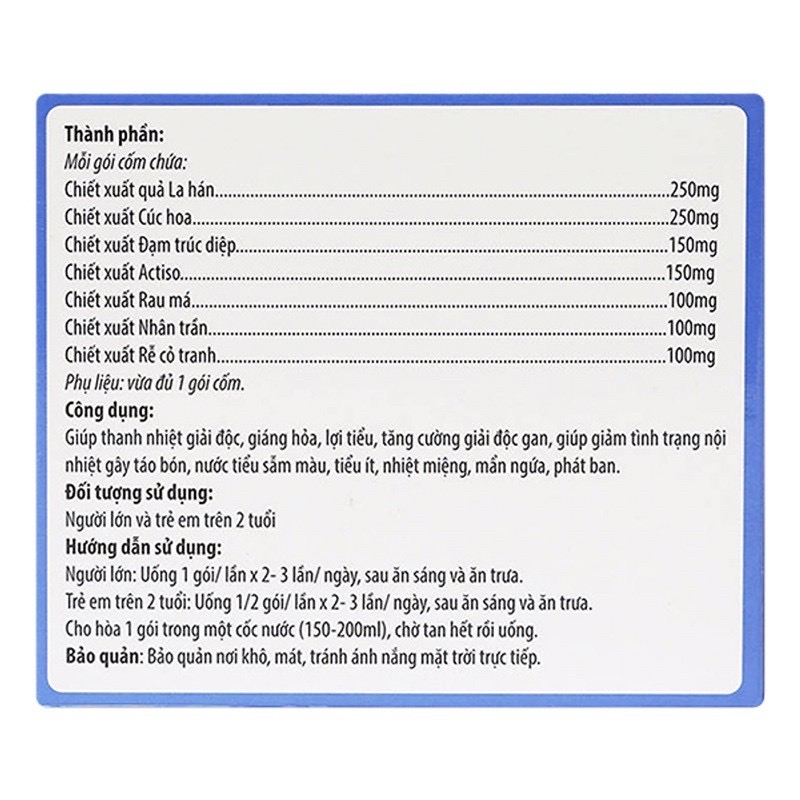 - THÀNH PHẦN Mỗi gói cốm 7g chứa: Chiết xuất La hán quả: 250mg Chiết xuất Cúc hoa: 250mg Chiết xuất Đạm trúc diệp: 150mg Chiết xuất Actiso: 150mg Chiết xuát Rau má: 100mg Chiết xuất Nhân trần: 10mg Chiết xuất Rễ cỏ tranh: 100mg Phụ liệu: Lactose, đường vừa đủ 1 gói cốm.