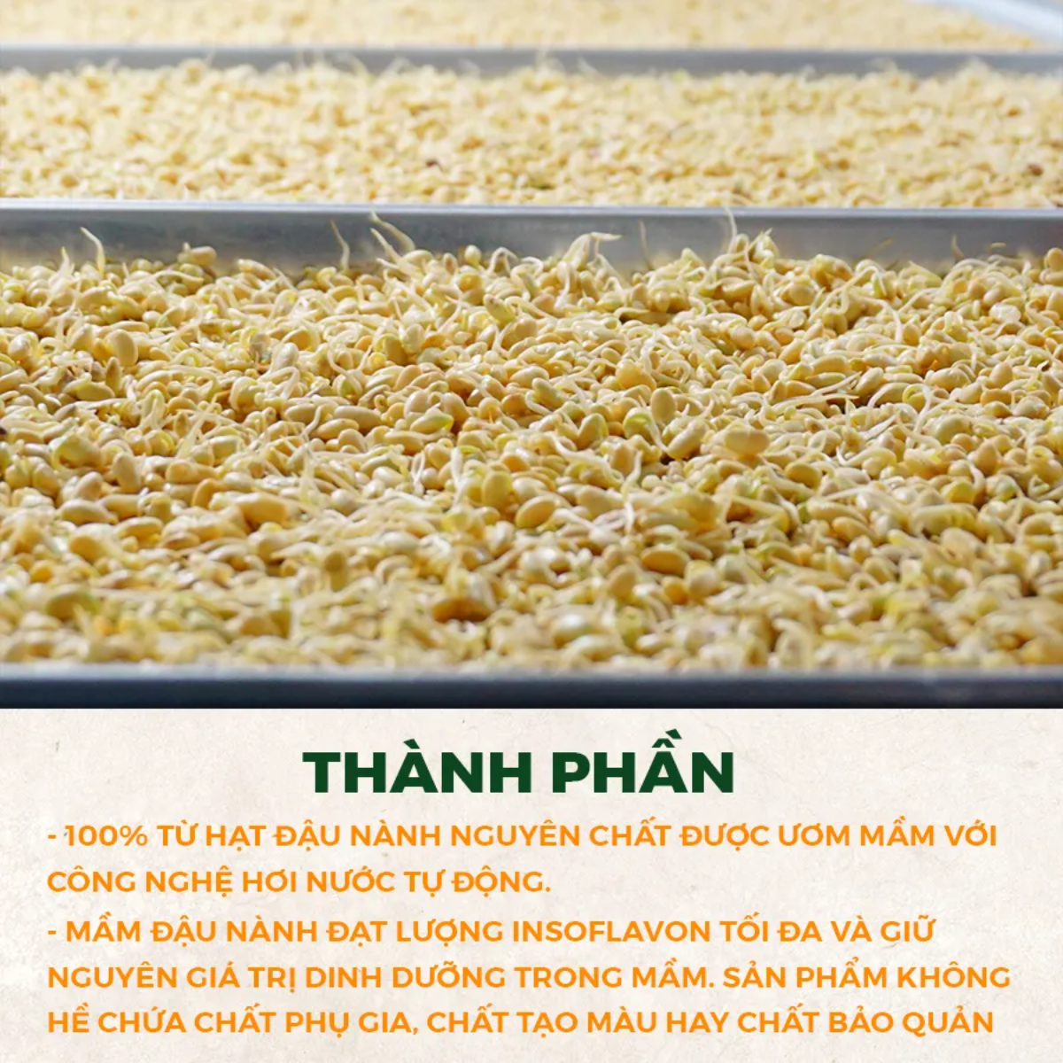 ❉ Mầm đậu nành MS được sản xuất từ những hạt đậu thuần chủng vùng trồng nguyên liệu tại Lâm Đồng.