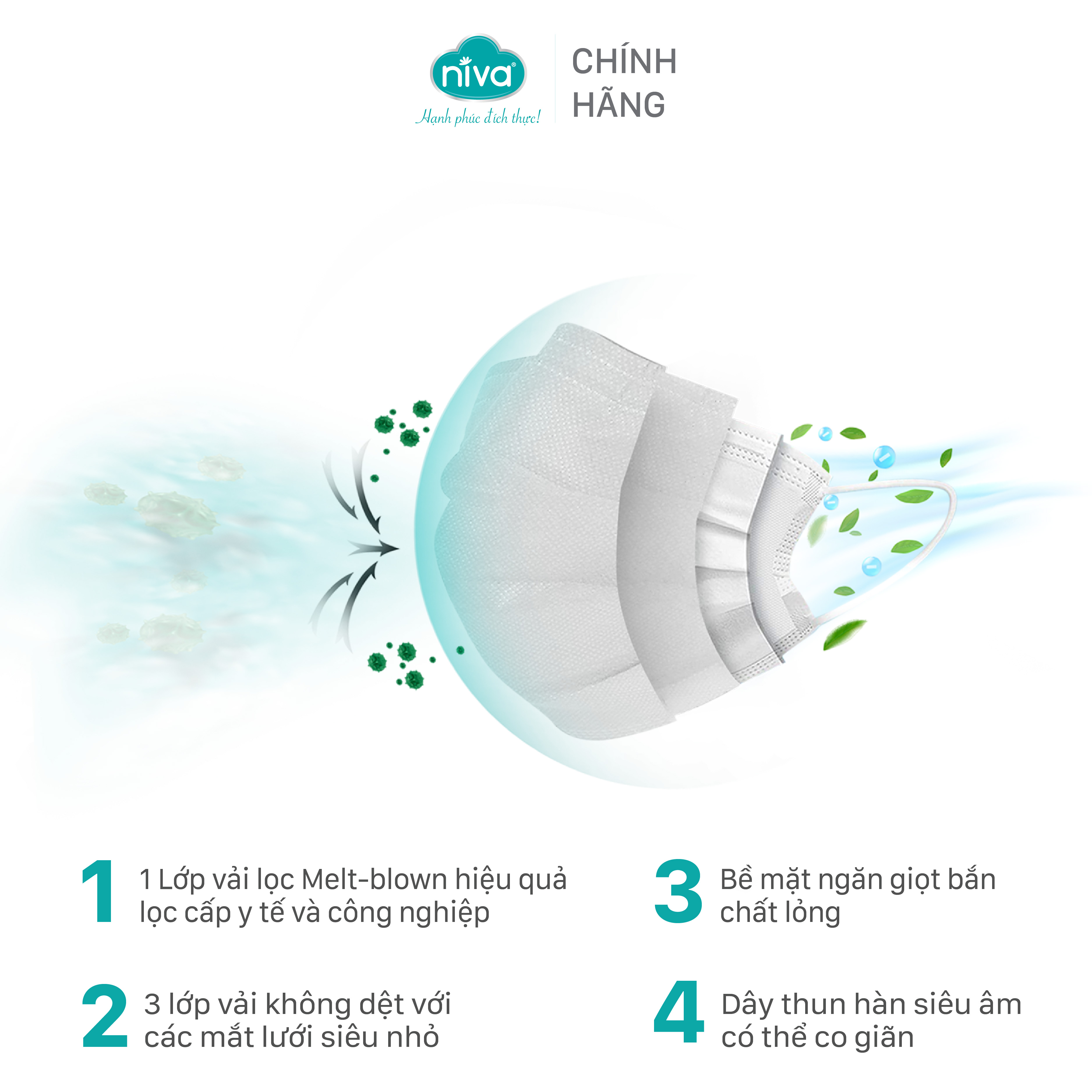 - Sản phẩm được làm từ 4 lớp bao gồm: 3 lớp vải không dệt, 1 lớp màng lọc Meltblown.