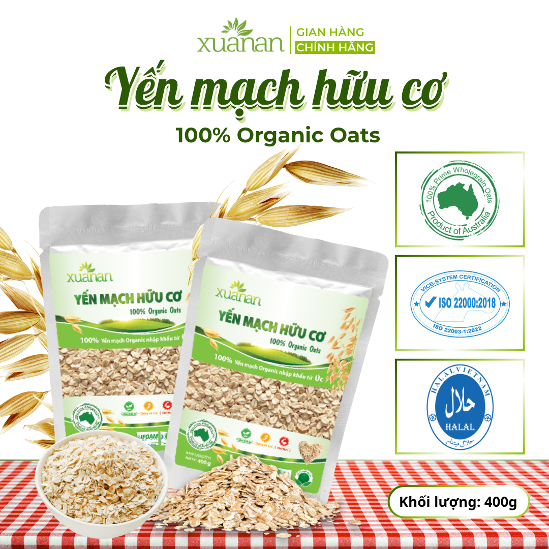 COMBO 11 TÚI YẾN MẠCH HỮU CƠ ÚC (100% AUSTRALIAN ORGANIC OATS)- TÚI 400G Yến Mạch Hữu Cơ là loại ngũ cốc giàu chất xơ, đạm, vitamin và dưỡng chất tự nhiên. Được mệnh danh là Vua của Ngũ cốc. 100% Yến Mạch Hữu Cơ Xuân An được nhập khẩu từ ÚC. Thành phần : 100% Yến mạch hữu cơ nhập khẩu từ Úc. Không chất bảo quản, không hương liệu, không phụ gia. Yến mạch hữu cơ giúp giảm nguy cơ tim mạch, tiểu đường, giảm lượng cholesterol trong máu. Phòng tránh bệnh loãng xương, ung thư, béo phì, táo bón. Giúp tăng khả năng tập trung, tránh suy nhược thần kinh, cũng cố hệ miễn dịch. Yến mạch hữu cơ có khả năng chống viêm và làm lành các vết thương trên da. Mặt nạ yến mạch làm sạch da và mịn da, dưỡng chất saponin giúp chống lão hóa hiệu quả.