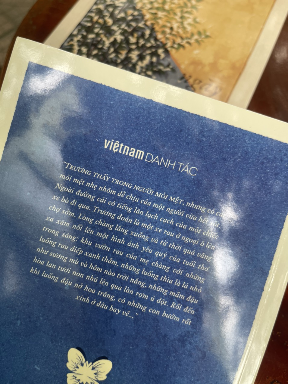 "TRƯƠNG THẤY TRONG NGƯỜI MỎI MỆT, nhưng có cái mỏi mệt nhẹ nhõm dễ chịu của một người vừa hết sốt. Ngoài đường cái có tiếng lăn lạch tạch của một chiếc xe bò đi qua. Trương đoán là một xe rau ở ngoại ô lên chợ sớm. Lòng chàng lắng xuống và từ thời quá vãng xa xăm nổi lên một hình ảnh yêu quý của tuổi thơ trong sáng: khu vườn rau của mẹ chàng với những luống rau diếp xanh thắm, những luống thìa là lá nhỏ như sương mù và hôm nào trời nắng, những mầm đậu hòa lan tươi non nhú lên qua làn rơm ủ dột. Rồi đến khi luống đậu nở hoa trắng, có những con bướm rất xinh ở đâu bay về"