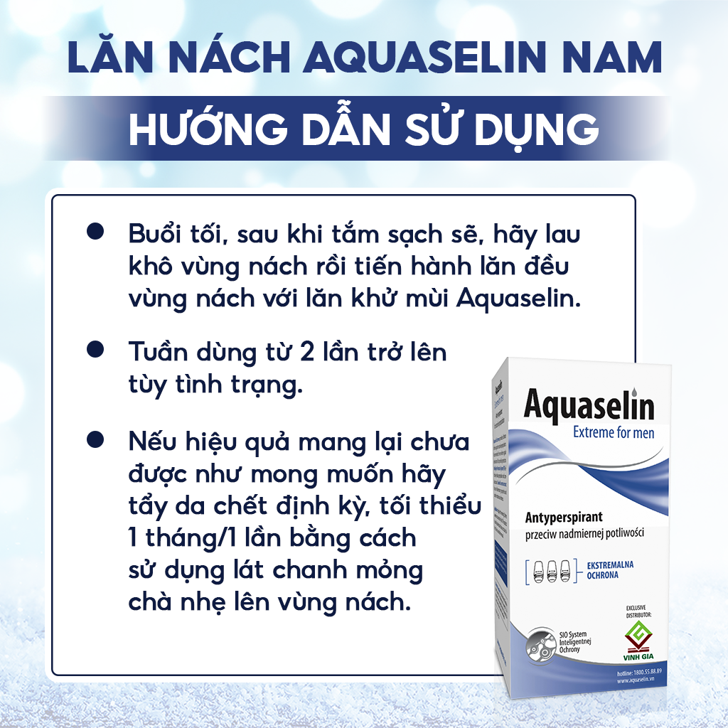 Mua tại TiktokAquaselin Lăn khử mùi Aquaselin dành cho nam giới dùng cho vùng nách đổ mồ hôi & mùi hôi từ vừa phải đến nhiều. THÀNH PHẦN SẢN PHẨM Thành phần từ thiên nhiên: Aqua, Aluminum Chlorohydrate ( mủ cây hương nhu), Steareth - 2, Octyldodecanol, Steareth - 21,Isopropyl Myristate, Dipropylene Glycol, Panthenol, Bisabolol, Allantoin, Boswellia Serrata Gum CÔNG DỤNG SẢN PHẨM • Sản phẩm lăn nách dành cho nam giới, dùng cho mọi loại da. • Sản phẩm được khuyên dùng cho nam giới khi các sản phẩm khử mùi thông thường không bảo vệ được. CÁCH SỬ DỤNG • Lựa chọn sản phẩm chuyên biệt cho Nam riêng, nữ riêng. • Dùng vào buổi tối 1 tuần từ 2 lần trở lên tùy tình trạng, sau khi tắm và trên vùng nách đã được lau khô. Sáng hôm sau tắm cũng không cần lăn lại • Tẩy da chết định kỳ, tối thiểu 1 tháng/1 lần. Cách đơn giản nhất có thể sử dụng lát chanh chà nhẹ lên vùng nách. ƯU ĐIỂM NỔI BẬT • Tác dụng kéo dài đến vài ngày. • Khô thoáng nhanh. • Có tác dụng cho nhiều đối tượng • Thành phần thiên nhiên. Không mùi, không cồn, không gây thâm nách, không gây ố vàng nách áo. Không chứa chất tạo màu, độ pH trung tính, sản phẩm dành cho mọi loại da. Sản phẩm được hấp thu dễ dàng, không gây nhờn dính • Được sản xuất tại Nhà máy đạt chuẩn GMP châu Âu. Đã được thử nghiệm thực tế: cho hiệu quả và an toàn, dùng được cho cả phụ nữ mang thai, sau sinh, trẻ đang trong độ tuổi dậy thì, da dị ứng, xạ trị hoặc sau triệt lông vẫn dùng được. • Sản phẩm chuyên biệt cho nam và nữ LƯU Ý: MUA HÀNG CHÍNH HÃNG Trên mỗi vỏ hộp sản phẩm, có tem điện tử phủ cào xác thực hàng chính hãng, tem chống hàng giả và logo của Dược phẩm Vinh Gia. Khi mua hàng, Qúy khách hãy kiểm tra TEM HÀNG CHÍNH HÃNG