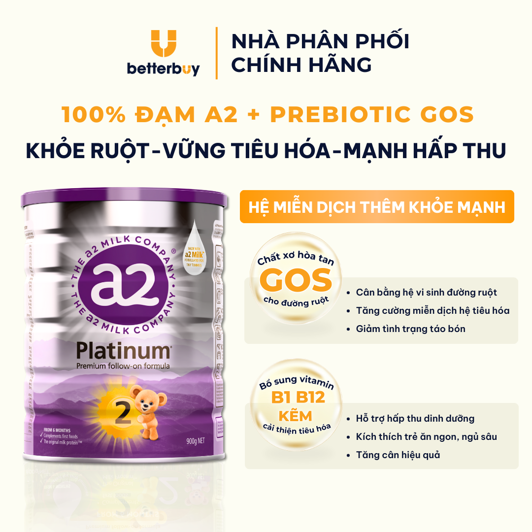 a2 Platinum Premium - Sữa công thức cao cấp nhập khẩu trực tiếp từ New Zealand, 100% đạm A2 chuyên hỗ trợ tiêu hóa và phát triển toàn diện cho trẻ Thông tin sản phẩm: ◈ Thương hiệu: The a2 Milk Company ◈ Xuất xứ: New Zealand ◈ Đối tượng sử dụng: Số 1: Trẻ từ 0–6 tháng Số 2: Trẻ từ 6–12 tháng Số 3: Trẻ từ 12 tháng trở lên Số 4: Trẻ từ 3 tuổi trở lên ◈ Khối lượng: 900g ◈ Hạn sử dụng: 24 tháng kể từ ngày sản xuất (Xem trên bao bì) Lợi ích sản phẩm: ◈ 100% đạm A2, không lẫn đạm A1: an toàn với hệ tiêu hóa nhạy cảm, giảm nôn trớ, táo bón, khó tiêu ◈ Bổ sung chất xơ GOS: cân bằng hệ vi sinh đường ruột, kích thích trẻ ăn ngon, ngủ ngon ◈ Bổ sung DHA, EPA: phát triển trí não, thị giác, tăng cường khả năng tư duy - quan sát ◈ Nguồn Canxi dồi dào - 104 mg/100ml: hệ xương và răng chắc khỏe, hỗ trợ tăng trưởng chiều cao ◈ 16 vitamin & khoáng chất thiết yếu: tăng cường đề kháng & miễn dịch khỏe mạnh Hướng dẫn sử dụng: ◈ Vệ sinh tay và dụng cụ pha thật kỹ, tiệt trùng trước khi dùng. ◈ Đun sôi nước, để nguội khoảng 30 phút (nhiệt độ khoảng 40°C). ◈ Dùng 1 muỗng gạt ngang pha với 50ml nước. ◈ Lắc đều cho đến khi tan hết bột. ◈ Kiểm tra nhiệt độ sữa trước khi cho bé uống. ◈ Dùng ngay sau khi pha. Bỏ phần thừa sau 1 giờ. Hướng dẫn bảo quản: ◈ Bảo quản nơi thoáng mát, khô ráo. ◈ Đóng kín nắp sau mỗi lần sử dụng. ◈ Sau khi mở nắp, sử dụng trong vòng 4 tuần. ◈ Không bảo quản trong tủ lạnh. ◈ Dùng dụng cụ khô, sạch để lấy sữa – không làm ướt muỗng. Cam kết: ◈ Đại lý phân phối chính thức của The a2 Milk Company - Cam kết sản phẩm chính hãng 100%. ◈ Sản phẩm giá tốt - còn hạn sử dụng xa. ◈ Hỗ trợ tư vấn 24/7. Lưu ý: ◈ Sữa mẹ là thức ăn tốt cho trẻ sơ sinh và trẻ nhỏ. ◈ Sản phẩm phù hợp bổ sung cho trẻ trong giai đoạn từ 1 tuổi trở lên. Không dùng cho người dị ứng với sữa bò, cá hoặc đậu nành.