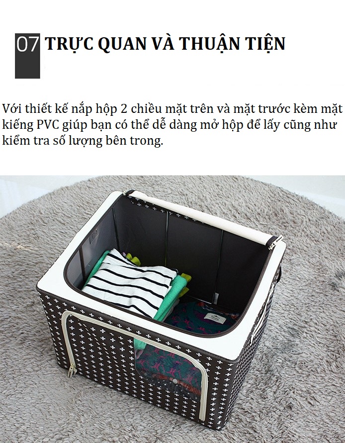 Mua tại Tiktok• Túi đựng đồ đa năng làm bằng khung thép, kết cấu hình chữ nhật phân bố đều các góc có khả năng chịu lực cao, chắc chắn, bền. • Vải chống thấm nước • Kích thước: Dài 50 cm x Rộng 40 cm x Cao 28cm. • Quai cầm phía bên hông tủ vải giúp tiện lợi trong việc cầm, xách, di chuyển, tháo lắp dễ dàng, tiết kiệm không gian. • Có thể xếp chồng lên nhau thành túi vải nhiều ngăn, tạo thành những hình khối phù hợp với mọi không gian sống, tận dụng không gian tuyệt đối. • So với những cái tủ quần áo to, thì tủ vải thông minh có thể đặt ép sát vào tường, không chiếm nhiều diện tích phòng. • Khung thép rắn chắc có thể chịu được trọng lực lớn .