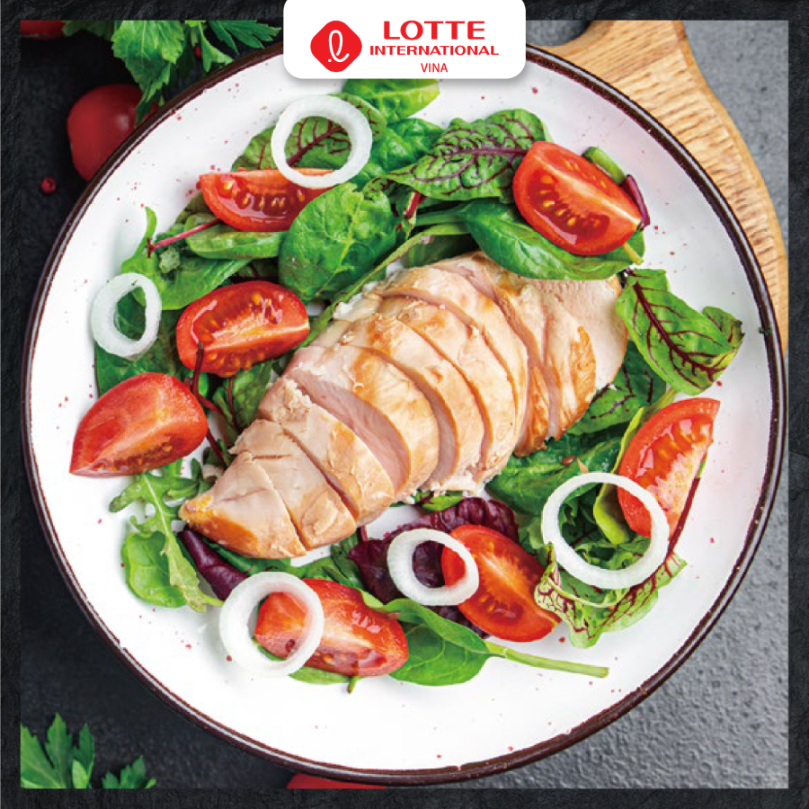 Ức gà (88 %), nước, nước tương, dầu mè, hỗn hợp gia vị (muối, chất điều vị (mononatri L-glutamat (INS 621), dinatri 5'- ribonucleotid (INS 635)), đường, bột tiêu), bột tỏi, rượu, gừng, chất chống oxy hóa: natri erythorbat (INS 316), chất bảo quản (natri propionat (INS 281), natri acetat (INS 262(i))), chất điều chỉnh độ acid/chất nhũ hóa: natri lactat ( INS 325)