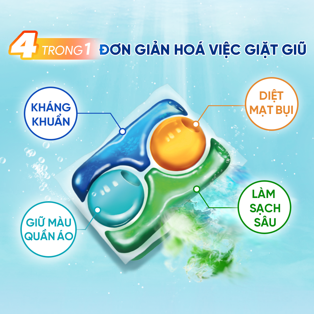 TẠI SAO LỰA CHỌN VIÊN GIẶT QUẦN ÁO thay thế các loại giặt tẩy thông thường? Đơn giản hóa việc giặt giũ chỉ với 1 sản phẩm 1 thao tác: - Đa năng: Tất cả trong 1 viên giặt chất tẩy vết bẩn, chất làm mềm vải, chất khử khuẩn- khử mùi, bảo vệ màu quần áo (tương tự sự kết hợp của nước giặt và nước xả) - Tiện lợi: Dùng được tới 7 kg quần áo chỉ với 1 viên; Dùng được cho cả máy giặt cửa trên và máy giặt cửa trước ; Dùng khi giặt bằng nước nóng/ lạnh đều có hiệu quả như nhau -Bảo vệ tuổi thọ máy giặt: Công thức ít bọt bảo vệ lồng giặt, gia tăng tuổi thọ máy giặt (sử dụng thêm viên tẩy lồng giặt định kỳ để làm sạch và bảo vệ lồng máy giặt) - Hiệu quả hơn bạn nghĩ: Chi phí tiết kiệm hơn so với 1 lần giặt thông thường - Đơn giản hóa danh sách mua sắm - Tiết kiệm