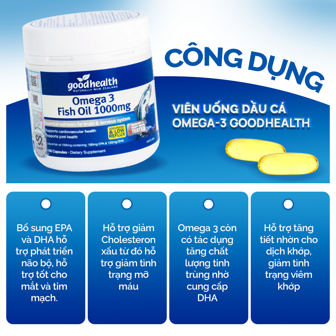 GIỚI THIỆU SẢN PHẨM VIÊN DẦU CÁ GOODHEALTH OMEGA 3 Dầu cá Goodhealth Omega 3 hộp 150 viên nang. Goodhealth Omega 3 Fish Oil 1000mg hay còn gọi là dầu cá Goodhealth Omega 3. Sản phẩm được chiết xuất 100% từ dầu cá biển chất lượng hảo hạng từ vùng biển New Zealand. Đây là vùng biển lạnh, sâu và sạch nhất thế giới.  Viên dầu cá Goodhealth Omega 3 cung cấp hàm lượng DHA và EPA thiết yếu giúp phát triển não bộ, tăng cường thị giác, hỗ trợ giảm viêm, đau khớp, cải thiện vận động khớp, ngăn ngừa và cải thiện các bệnh lý tim mạch. THÀNH PHẦN CỦA VIÊN DẦU CÁ GOODHEALTH OMEGA 3 Thành phần trong 1 viên nang Goodhealth Omega 3 có chứa:  Thành phần  Hàm lượng Dầu cá biển (1000mg) EPA 180mg DHA 120mg   ƯU ĐIỂM NỔI BẬT CỦA VIÊN DẦU CÁ GOODHEALTH OMEGA 3 Nguồn nguyên liệu hảo hạng Viên dầu cá Goodhealth Fish Oil 1000mg được sản xuất tại New Zealand, không đơn thuần là dầu cá nuôi như các sản phẩm đại trà, sản phẩm này được chiết xuất từ nguồn nguyên liệu hảo hạng – những loài cá từ vùng biển lạnh, sâu dưới đại dương. Đây là những loại cá nhỏ, có mức độ độc tố thấp và rất giàu Omega 3. Quy trình sản xuất hiện đại Ở New Zealand, Bộ Nông nghiệp và Lâm nghiệp đã đưa ra các tiêu chuẩn nghiêm ngặt nhằm quản lý ngành công nghiệp chế biến dầu cá Omega 3. Quá trình chưng cất dầu cá hiện đại của Goodhealth giúp các tạp chất: Hg, PCBs hay dioxin đều được lược bỏ triệt để chỉ giữ lại những dưỡng chất dầu cá tinh khiết, quý giá từ thiên nhiên. Chiết xuất 100% dầu cá biển tự nhiên - cung cấp dưỡng chất thiết yếu Omega 3 Fish Oil 1000mg cung cấp hàm lượng DHA và EPA thiết yếu, giúp phát triển não bộ, tăng cường thị giác, hỗ trợ giảm viêm, đau khớp, cải thiện vận động khớp, ngăn ngừa và cải thiện các bệnh lý tim mạch… Sản phẩm được ưa chuộng rộng rãi trên thế giới và hàng nghìn khách hàng Việt Nam tin dùng. Dầu cá Goodhealth được đóng gói viên nang mềm, không có mùi tanh của cá, dễ uống, dễ hấp thu.   CÔNG DỤNG CỦA VIÊN DẦU CÁ GOODHEALTH OMEGA 3
