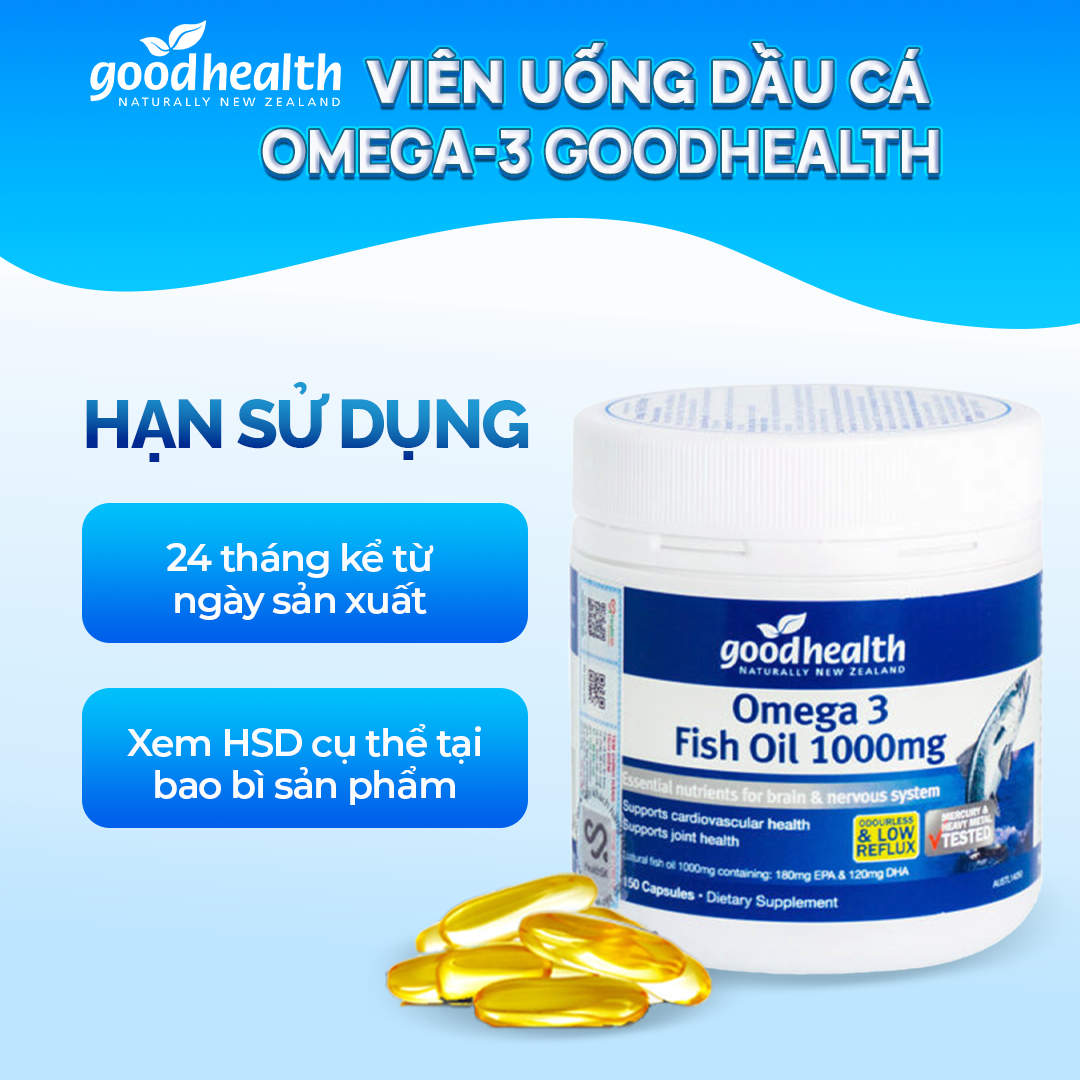 • Trẻ em trong giai đoạn phát triển.   HƯỚNG DẪN SỬ DỤNG DẦU CÁ GOODHEALTH OMEGA 3  Người lớn: Uống 1-3 viên/ ngày cùng với bữa ăn hoặc theo lời khuyên của chuyên gia.  Trẻ em (từ 2 - 12 tuổi): Uống 1-2 viên/ ngày cùng với bữa ăn hoặc theo lời khuyên của chuyên gia. Đối với trẻ dưới 5 tuổi, nên cắt nhỏ viên nang và cho vào thức ăn để tránh nguy cơ bị hóc. Nên uống ngay sau khi ăn, vì thức ăn giúp hấp thu Omega 3 tốt hơn. Hoặc người sử dụng có thể trộn cùng với thức ăn. Khuyến cáo: Không uống vượt quá liều dùng hàng ngày được khuyến cáo. Không sử dụng nếu mẫn cảm với thành phần của sản phẩm.   NHẬN DIỆN HÀNG CHÍNH HÃNG Thực phẩm bảo vệ sức khỏe Omega 3 Fish Oil 1000mg được nhập khẩu trực tiếp từ Goodhealth New Zealand. Sản phẩm được phân phối chính hãng tại Việt Nam bởi Công ty TNHH HealthSK. Tem QR code  Khi mua hộp Good Health Omega 3 Fish Oil 1000mg, bạn hãy cào lớp phủ bạc trên tem QR code để lấy mã QR hoặc mã bảo mật. Nhờ đó, bạn có thể xác thực thông tin về sản phẩm bằng cách: Soạn tin nhắn theo cú pháp: XT_Mã bảo mật và gửi 7039 (1000đ/ tin nhắn) Tải App Goodhealth G+ trên smartphone để quét mã QR. Tem nhãn phụ  Trên mỗi hộp Good Health Omega 3 Fish Oil 1000mg đều có 1 tem nhãn phụ bằng tiếng Việt được thiết kế rõ ràng và in trên giấy chất liệu dày dặn, trắng sáng, chữ màu xanh đậm, rõ nét. Tem nhãn phụ có ghi đầy đủ nội dung bao gồm: tên đầy đủ của sản phẩm, thành phần, công dụng, đối tượng sử dụng, cách dùng… Tem chống hàng giả  Trên mỗi vỏ hộp Good Health Omega 3 Fish Oil 1000mg đều có dán 1 tem chống hàng giả hologram (hay còn gọi là tem 7 màu). Tem có hình bầu dục, in chữ Goodhealth – Naturally New Zealand, khi nhìn dưới ánh sáng có phản quang óng ánh.  Mã vạch  Bạn có biết các sản phẩm chính hãng được nhập khẩu nguyên hộp từ New Zealand có mã vạch bắt đầu từ 940 – 949. Vì vậy, khi cầm hộp sản phẩm Goodhealth Omega 3 Fish Oil 1000mg chính hàng trên tay, bạn sẽ thấy mã vạch bắt đầu là 940 hoặc 949, mã vạch rõ ràng, không bị nhòe hoặc mờ. BẢO QUẢN Nơi khô ráo, thoáng mát, tránh ánh sáng trực tiếp, nhiệt độ dưới 30°C THỜI HẠN SỬ DỤNG : 08/2027 BATCH - T24J   36 tháng kể từ ngày sản xuất Hạn sử dụng ghi trên bao bì Sản phẩm này không phải là thuốc và không có tác dụng thay thế thuốc chữa bệnh.