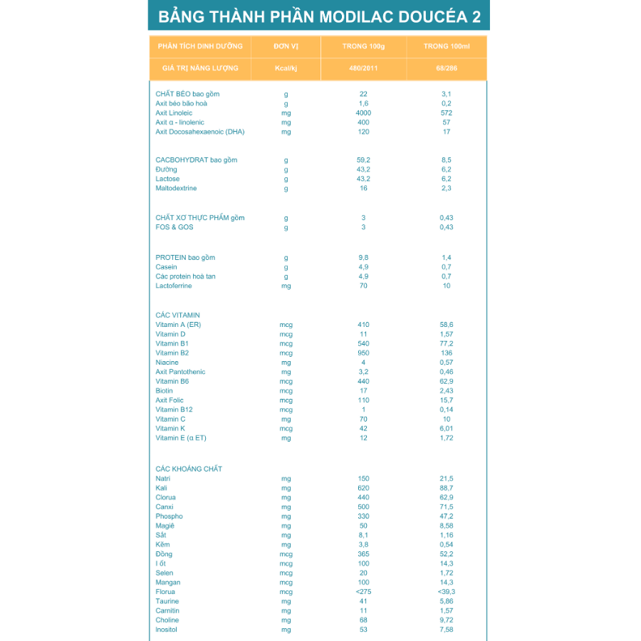 Sữa mẹ là thức ăn tốt nhất cho sức khỏe và sự phát triển toàn diện của trẻ sơ sinh và trẻ nhỏ.   Sữa bột cao cấp Modilac Doucéa số 2 dành cho trẻ từ 6 - 12 tháng tuổi được nhập khẩu nguyên hộp từ Pháp   MODILAC SỮA NỘI ĐỊA PHÁP - 9 ĐIỂM VÀNG CHẤT LƯỢNG CHO BÉ!   • Modilac cực kì dễ uống với vị sữa thanh nhạt, mùi thơm nhẹ, bé dễ dàng thích nghi khi chuyển từ sữa mẹ qua sữa công thức, hay đổi từ sữa công thức này qua sữa công thức khác • Sữa giúp bé tăng cân, tăng đề kháng, tăng ghi nhớ nhờ các dưỡng chất đắt đỏ: Lactoferrin, Bifidobacterium, Protein, DHA/ARA... • Sữa giúp bé giảm biếng ăn, giảm ốm vặt, giảm trằn trọc khó ngủ nhờ hệ dưỡng chất toàn diện, cung cấp năng lượng theo nhu cầu của cơ thể phù hợp với lứa tuổi   6 YÊN TÂM KHI MẸ CHỌN MODILAC SỮA NỘI ĐỊA PHÁP  • Modilac là dòng sữa nội địa cao cấp tại Pháp. • Là một trong ít nhãn sữa có viện nghiên cứu riêng. • Mỗi lon sữa Modilac Doucéa đều trải qua hơn 40 năm cải tiến không ngừng, phù hợp với sự phát triển của bé. • Trải qua hơn 800 lần xét nghiệm, hơn 200 lượt kiểm tra trước khi đưa ra thị trường. • Là dòng sữa công thức sản xuất bởi tập đoàn Savencia với hơn 60 xây dựng và phát triển. • Tại Việt Nam, Modilac Doucéa được phân phối bởi tập đoàn DETECH với lịch sử phát triển hơn 30 năm cùng đội ngũ nhân sự hàng nghìn người!   HƯỚNG DẪN SỬ DỤNG Lưu ý: Xuất xứ: Pháp Hạn sử dụng: 24 tháng Bảo quản sữa bột Modilac ở nơi thoáng mát, khô ráo trước và sau khi mở. Sau khi mở, đóng nắp thật chặt. Sử dụng trong vòng 1 tháng kể từ lần mở hộp đầu tiên.
