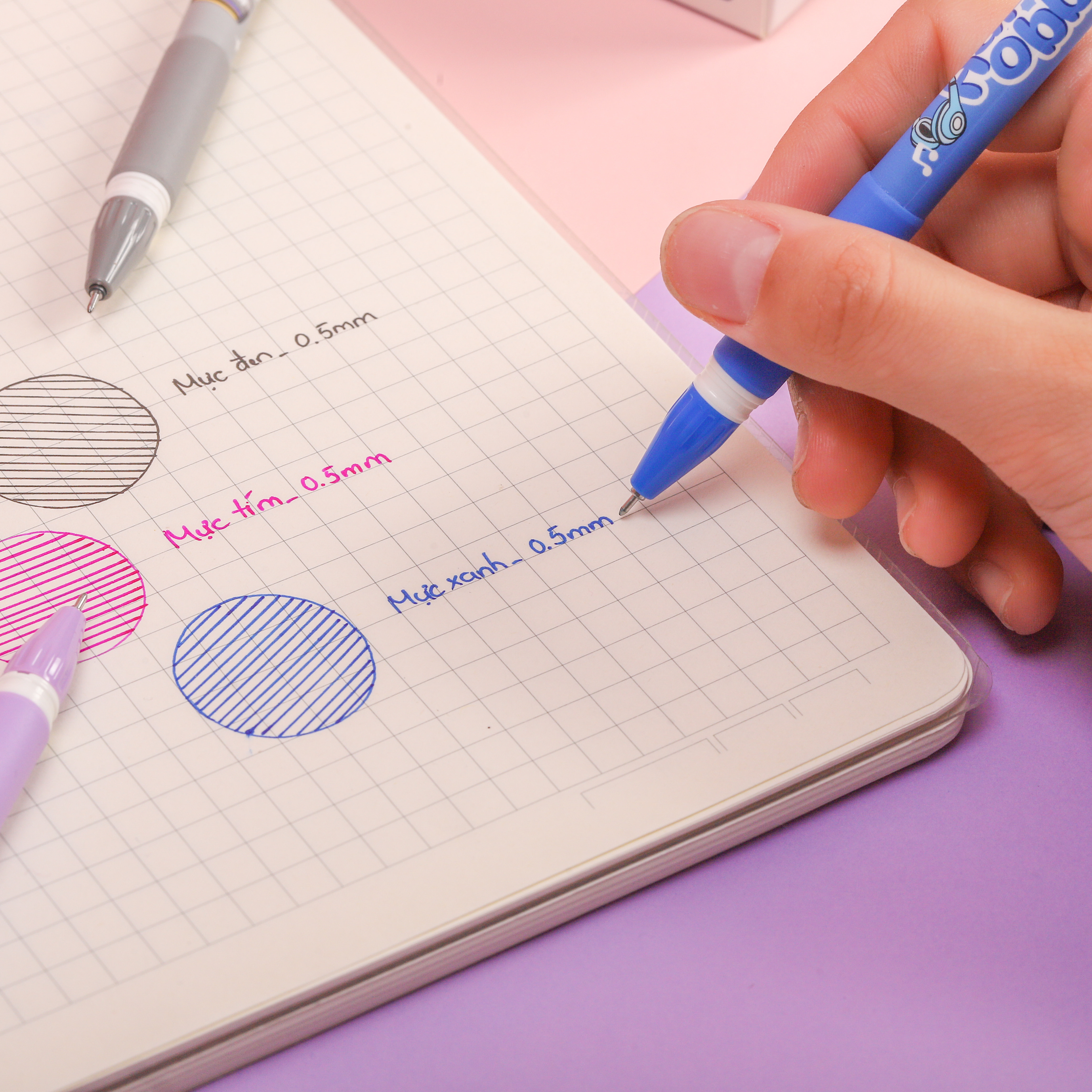 Tính năng nổi bật: Bút gel có thiết kế đơn giản và hiện đại. Thân và nắp bút bằng nhựa trong, sáng bóng sang trọng. Đặc biệt thân bút có những họa tiết nhân vật