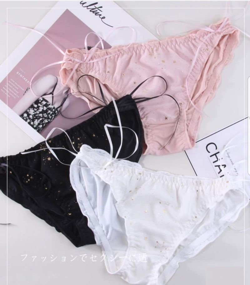 “Combo 5 quần lót Lụa Tơ Công Chúa S67 – chất lụa satin bóng mượt, họa tiết ngôi sao lấp lánh, dây rút hai bên, ôm vừa vặn, co giãn 4 chiều, mềm mại.” Điểm