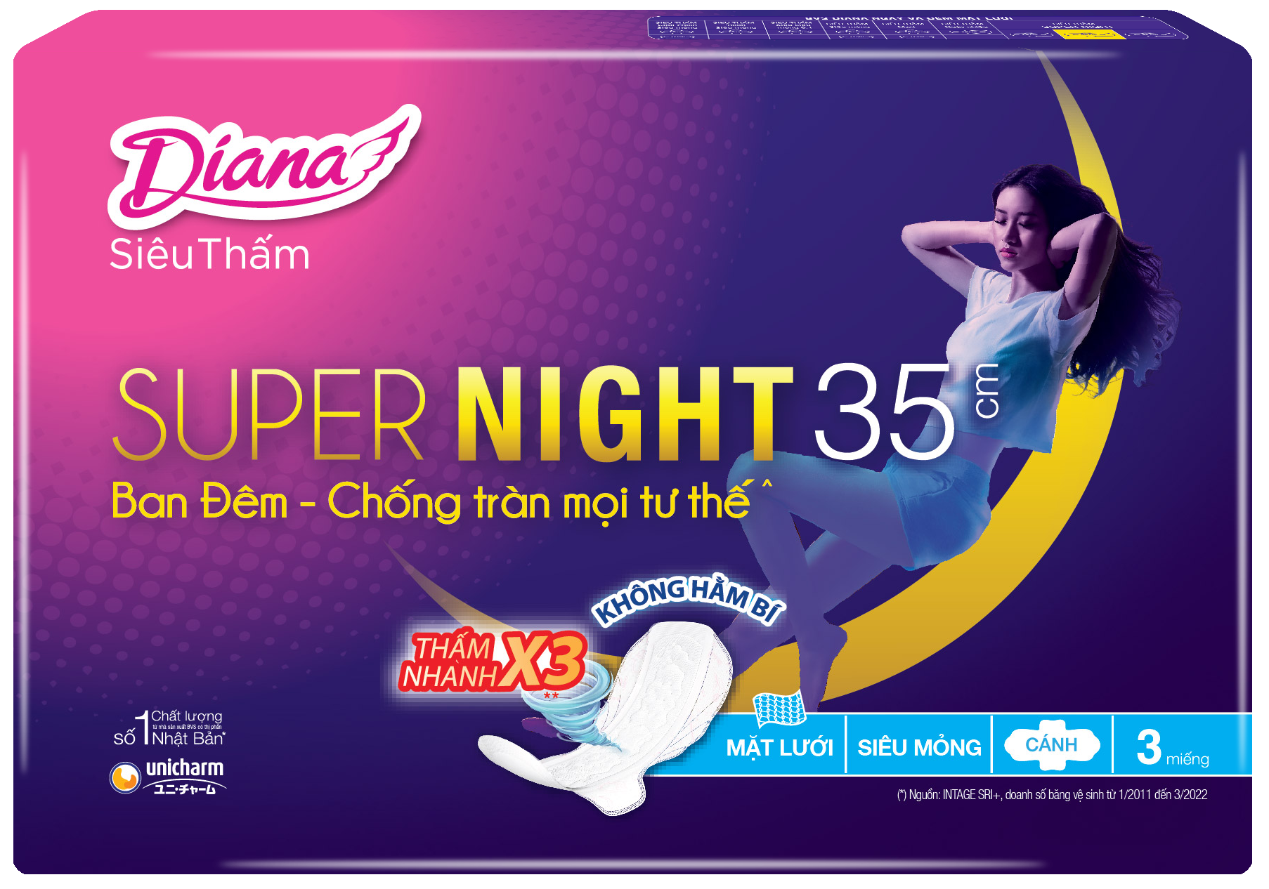 Combo 6 Băng Vệ Sinh Diana Super Night 35cm (Gói 3 Miếng) được các chuyên gia nghiên cứu và phát triển để góp phần tạo cho phái đẹp một giấc ngủ sâu trọn vẹn trong những ngày nhạy cảm.