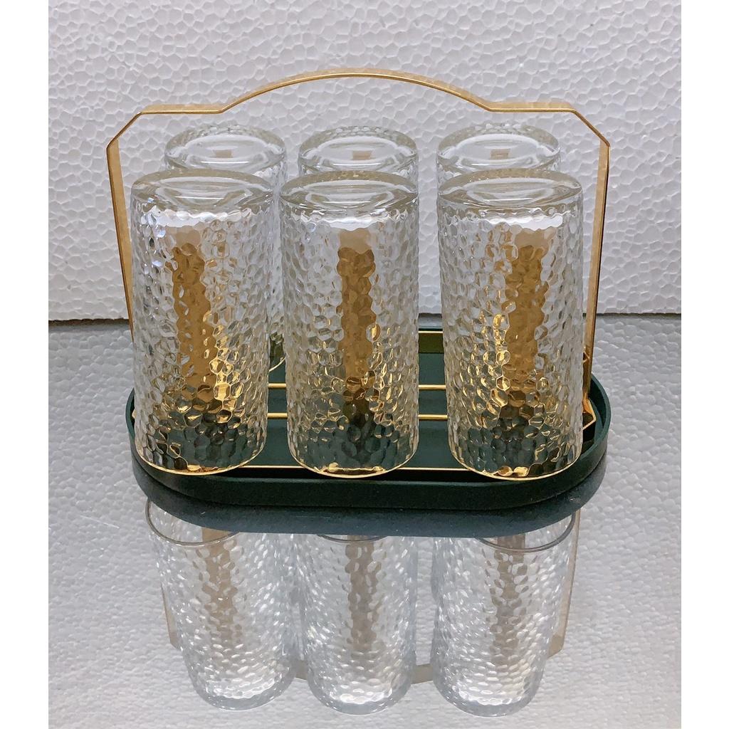 ✨Combo 6 cốc ống thủy tinh uống nước chịu nhiệt cao cấp vân sần kèm giá úp cốc có khay hứng nước ngọng vàng