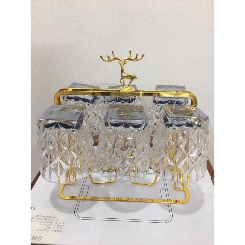 Combo Bộ 6 cốc thủy tinh cao cấp kèm giá úp tròn có khay hứng Combo gồm: 1 bình 6 cốc cốc 1 giá úp hươu 1 khay vương miện