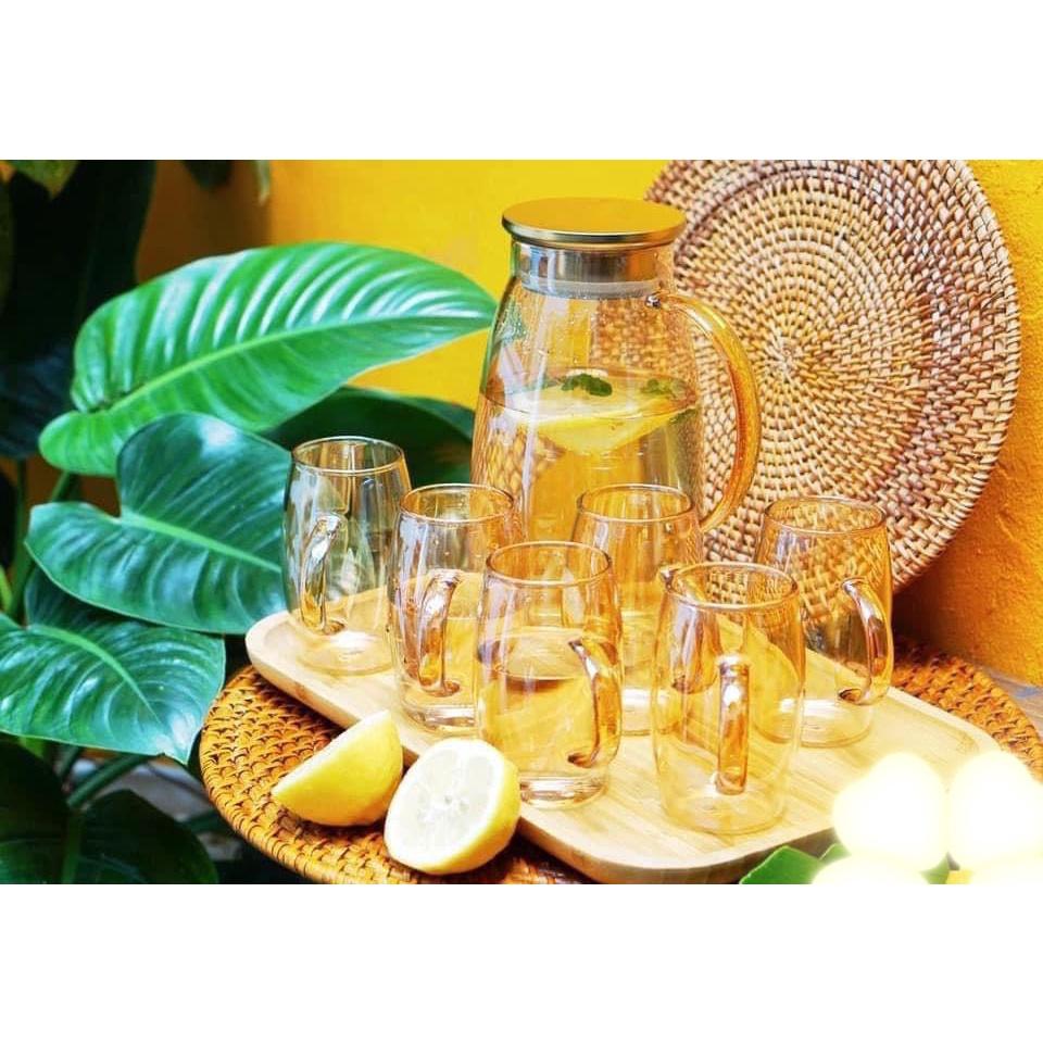 ✨Combo bộ bình đựng nước uống thủy tinh chịu nhiệt cao cấp kèm khay gỗ màu vàng