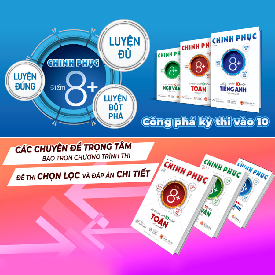 Combo Chinh phục luyện thi vào 10 Toán – Văn – Anh theo chủ đề là bộ sách được biên soạn bởi các tác giả uy tín và nhiều năm kinh nghiệm giảng dạy, luyện thi vào lớp 10. Cuốn sách được tổng hợp bài bản, cập nhật mới nhất các nội dung được đưa vào đề thi môn Toán những năm gần đây, chắc chắn sẽ giúp các em vững vàng kiến thức, tự tin đạt điểm cao trong kỳ thi sắp tới.