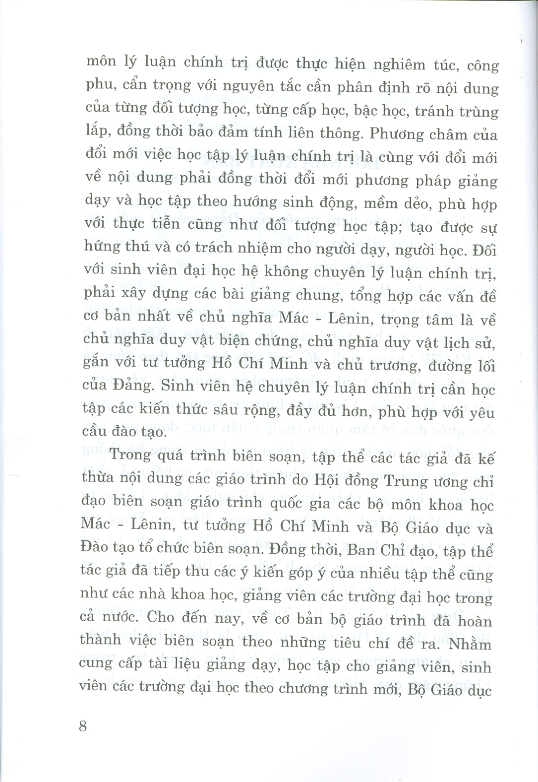 Bộ giáo trình được biên soạn theo tinh thần đổi mới cả về nội dung và phương pháp giảng dạy, tiếp cận với những phương pháp giáo dục mới, cập nhật những nghiên cứu, kiến thức lý luận chính trị mới, chú trọng liên hệ với thực tiễn công cuộc đổi mới, phát triển đất nước.