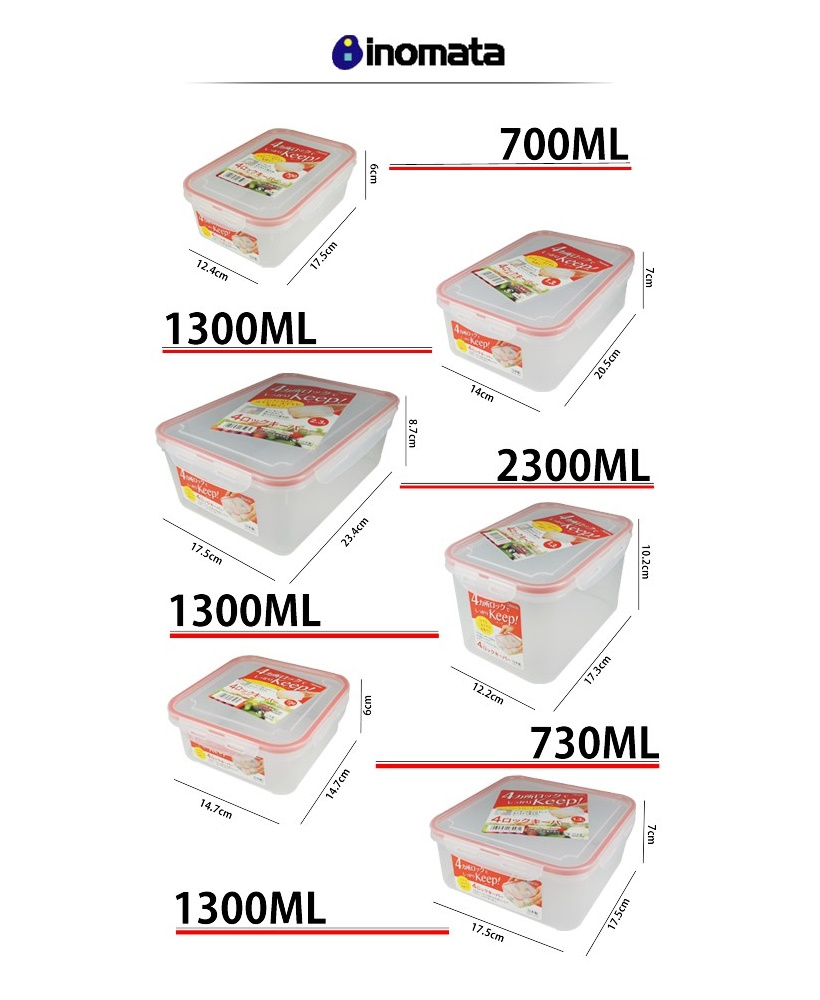 Hộp thực phẩm chữ nhật Inomata được làm bằng chất liệu nhựa PP cao cấp, kết hợp hoạt chất CEM-Bio kháng khuẩn, không chứa BPA, chịu được nhiệt độ từ -20 đến 140 độ C, không sản sinh ra các hoạt chất gây hại trong quá trình sử dụng. Sản phẩm đạt tiêu chuẩn chất lượng của FDA (Cục quản lý Dược phẩm và Thực phẩm Hoa Kỳ), sử dụng an toàn trong tủ lạnh, tủ đông và lò vi sóng. Sản phẩm có nắp khóa 4 chiều xung quanh chắc chắn vừa khít với gioăng silicone bảo đảm kín hơi và chống tràn không bị bay mùi thực phẩm, giữ vị tươi ngon cho thực phẩm khi bảo quản trong tủ lạnh, tủ đông tránh ám mùi sang những thực phẩm khác trong tủ. Hộp trong suốt dễ dàng quan sát tình trạng thực phẩm ở bên trong Sản phẩm có thể sử dụng để đựng & bảo quản thực phẩm trong tủ lạnh như các món dưa muối, dưa góp và các loại hạt, đồ khô, gia vị hoặc dùng để đựng thực phẩm thịt, cá dự trữ cho những chuyến dã ngoại, picnic, tạo sự tiện lợi tối đa cho người dùng.
