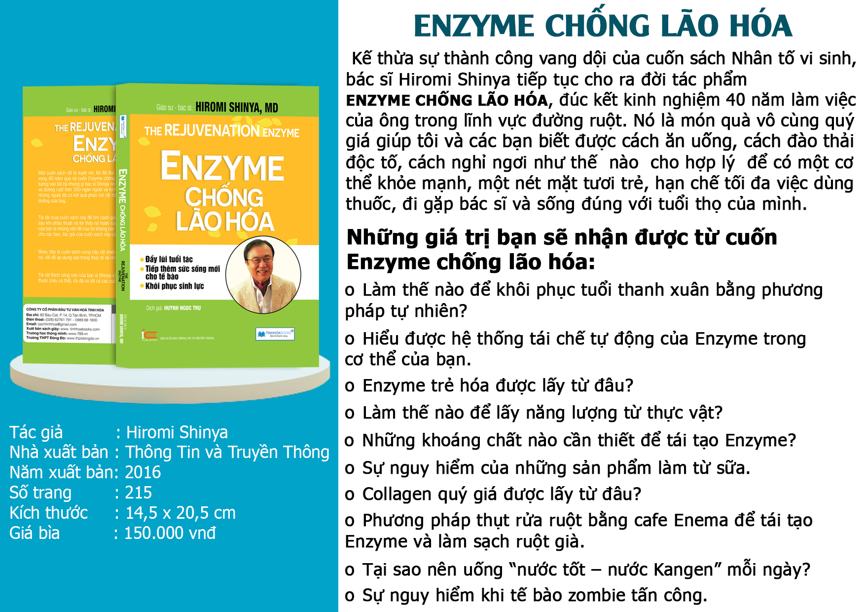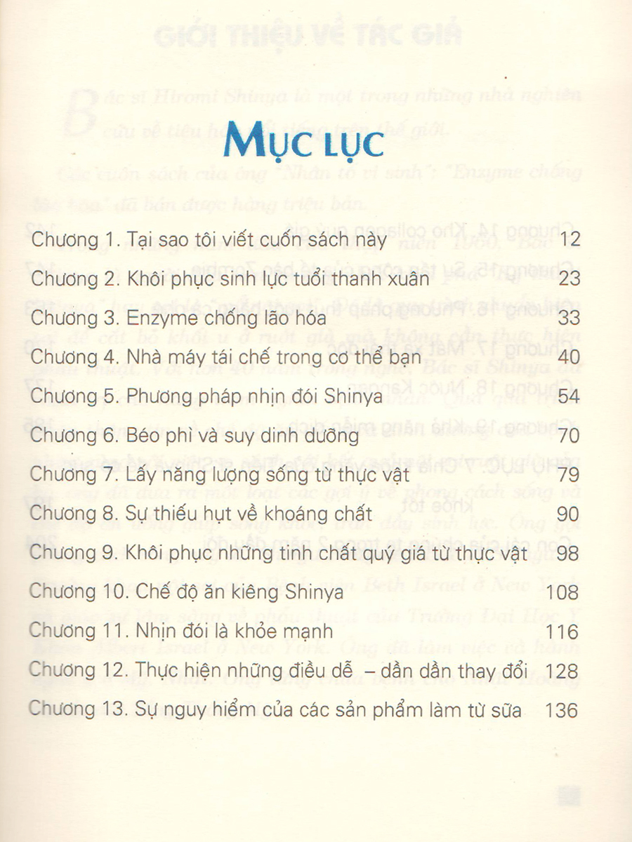 Kế thừa sự thành công vang dội của cuốn sách Nhân tố vi sinh, bác sĩ Hiromi Shinya tiếp tục cho ra đời tác phẩm ENZYME CHỐNG LÃO HÓA, đúc kết kinh nghiệm 40 năm làm việc của ông trong lĩnh vực đường ruột. Nó là món quà vô cùng quý giá giúp tôi và các bạn biết được cách ăn uống, cách đào thải độc tố, cách nghỉ ngơi như thế nào cho hợp lý để có một cơ thể khỏe mạnh, một nét mặt tươi trẻ, hạn chế tối đa việc dùng thuốc, đi gặp bác sĩ và sống đúng với tuổi thọ của mình.