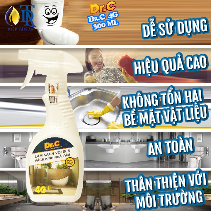 - Vết dầu mỡ lâu ngày, đóng cứng và dày: lặp lại quá trình trên vài lần. 2.Tẩy Cặn Canxi Nhà Tắm,Tẩy Vách Kính Vòi Sen Inox,Tẩy Ố Vàng Nhà Vệ Sinh Lavabo,Tẩy Rỉ Sét Inox-4G Dr.C 300ml A.CÔNG DỤNG: LÀM SẠCH: