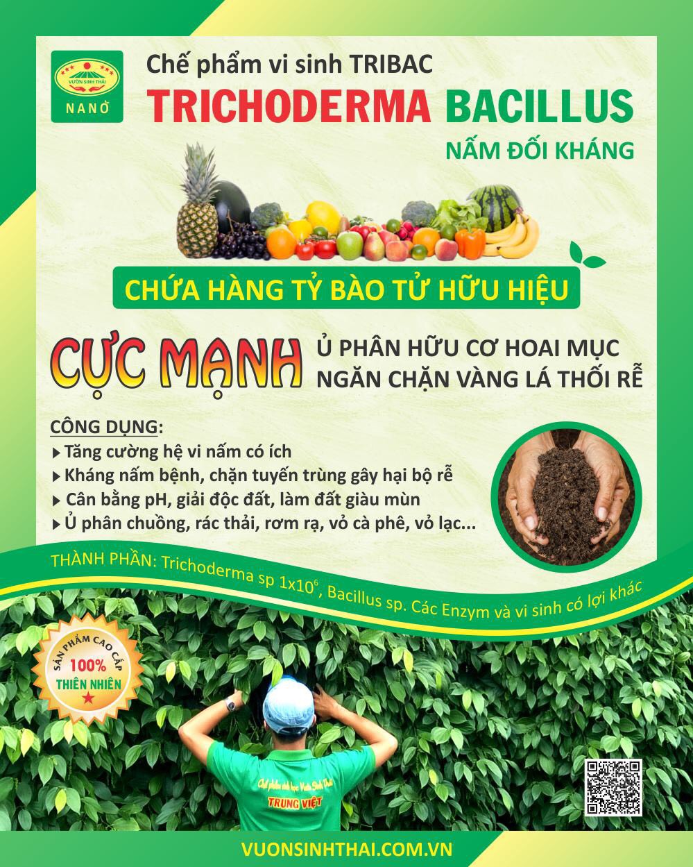 Chế phẩm vi sinh TRIBAC là dòng chế phẩm sinh học có chứa tổng hợp các vi nấm đối kháng trichoderma và vi khuẩn có lợi bacillus. Được lên men và sản xuất bằng công nghệ sinh học hiện đại, nên có hoạt năng ưu việt hoàn toàn so với các sản phẩm chỉ chứa nấm đối kháng trichoderma thông thường.