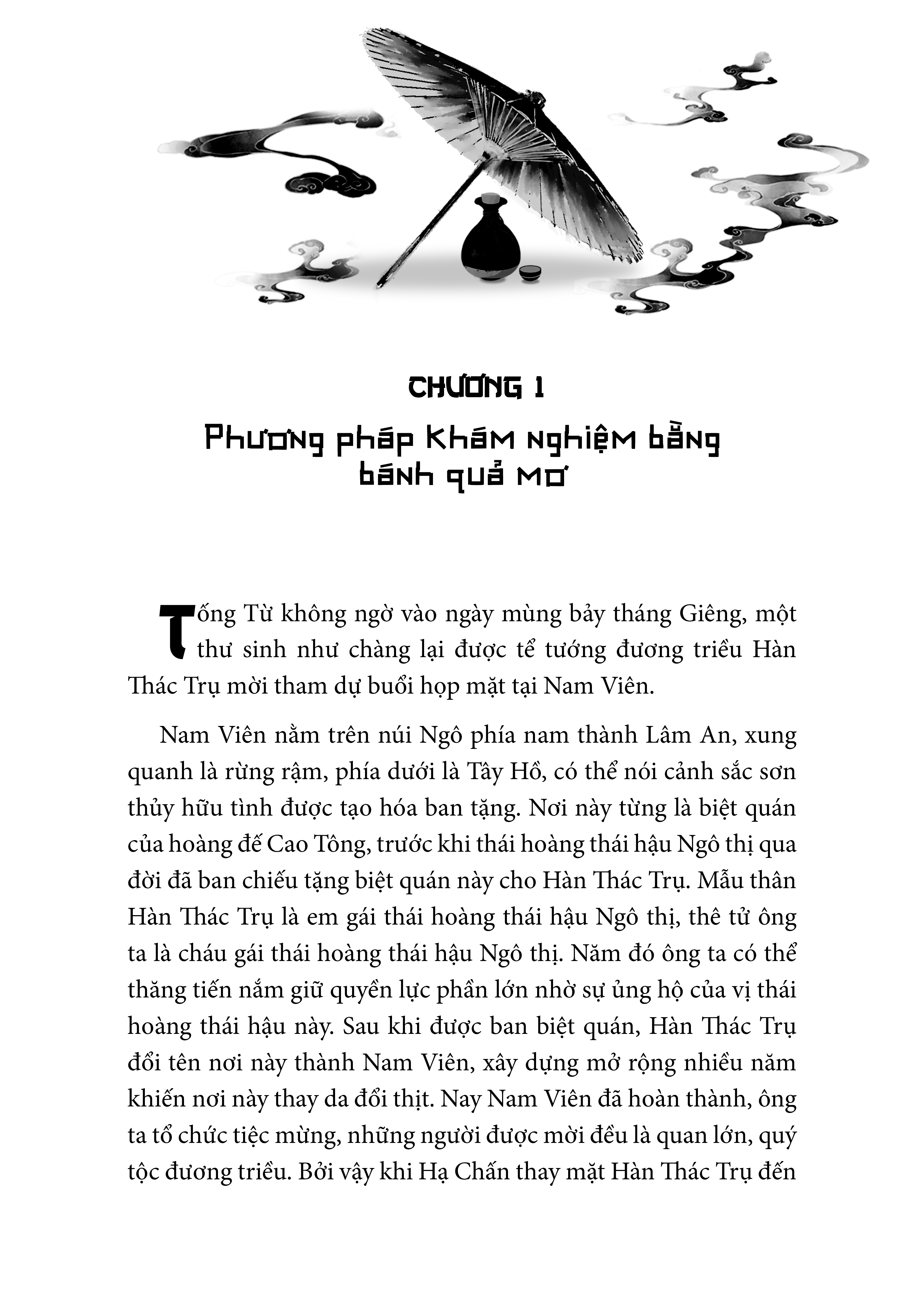 GIỚI THIỆU TÁC PHẨM   TỐNG TỪ TẨY OAN 1   Thuở thiếu thời của ông tổ pháp y học Trung Quốc Tống Từ như thế nào, bạn từng thắc mắc như vậy chưa? Thời Nam Tống, năm Khai Hy thứ nhất, Tống Từ hai mươi tuổi đang học tại Thái học viện thì vô tình bị cuốn vào vụ án tư nghiệp Hà Thái Ký bị sát hại tại từ đường nhà họ Nhạc và trở thành kẻ tình nghi lớn nhất của vụ án đó. Nhưng từ nhỏ đã theo chân phụ thân điều tra phá án, còn âm thầm học kỹ thuật khám nghiệm tử thi, nên chàng không chỉ vạch ra những nghi vấn tại hiện trường mà còn nhận được lệnh vua phải phá được vụ án này trong mười lăm ngày nhằm tự minh oan. Trong quá trình điều tra, chàng phát hiện đằng sau vụ án ấy còn nhiều vụ án khác, ẩn trong oan tình này còn nhiều oan tình nữa, giấu sâu dưới tầng chân tướng kia vẫn còn sự thật chưa được phơi bày.   Tình tiết tiểu thuyết khúc chiết, logic khó lòng xét nét, bí mật tầng tầng lớp lớp, dây mơ rễ má, tình thế biến chuyển liên lục. Hóc búa, kích thích, dễ gây nghiện. Chưa đọc tới trang cuối, bạn không bao giờ có thể biết được chân tướng!   Mời bạn theo chân Tống Từ và người bạn thân Lưu Khắc Trang đi điều tra, tìm ra chân tướng để rửa sạch oan khiên cho những sinh mệnh vô tội.   TỐNG TỪ TẨY OAN 2   Nối tiếp tập 1 của cuốn sách, sau khi Tống Từ và Lưu Khắc Trang tìm thấy thi thể của ca kỹ Trùng Nương tại Tây Hồ, Tống Từ buộc phải bàn giao vụ án cho phủ nha do chàng chỉ là đề hình can biện tạm thời được chỉ định để điều tra mỗi vụ án tại từ đường nhà họ Nhạc mà thôi.   Phủ nha tuy phát hiện ra cái chết của Trùng Nương có liên quan đến sứ thần nước Kim nhưng lại không tìm được đủ chứng cứ để buộc tội. Chỉ còn ba ngày nữa là sứ thần về nước, phủ nha không thể không nhờ đến sự giúp đỡ của Tống Từ.   Bắt tay vào điều tra, Tống Từ phát hiện ra nhiều nghi vấn kỳ lạ khi khám nghiệm thi thể của Trung Nương. Xác Trùng Nương chìm dưới Tây Hồ nhưng nàng không chết đuối, nguyên nhân tử vong hiện tại chưa rõ.   Cùng lúc đó, vụ mất tích bí ẩn của Nguyệt Nương, người tỷ tỷ mà Trùng Nương nhờ cậy Tống Từ tìm kiếm, cuối cùng cũng có manh mối. Hai người con gái, hai nàng ca kỹ của Hy Xuân Lâu, một kết cục.   Phải chăng ở Hy Xuân Lâu đang ẩn giấu bí mật động trời nào đó?   Liệu rằng Tống Từ có kịp tìm được chứng cứ để buộc tội sứ thần nước Kim trước khi sứ thần về nước?