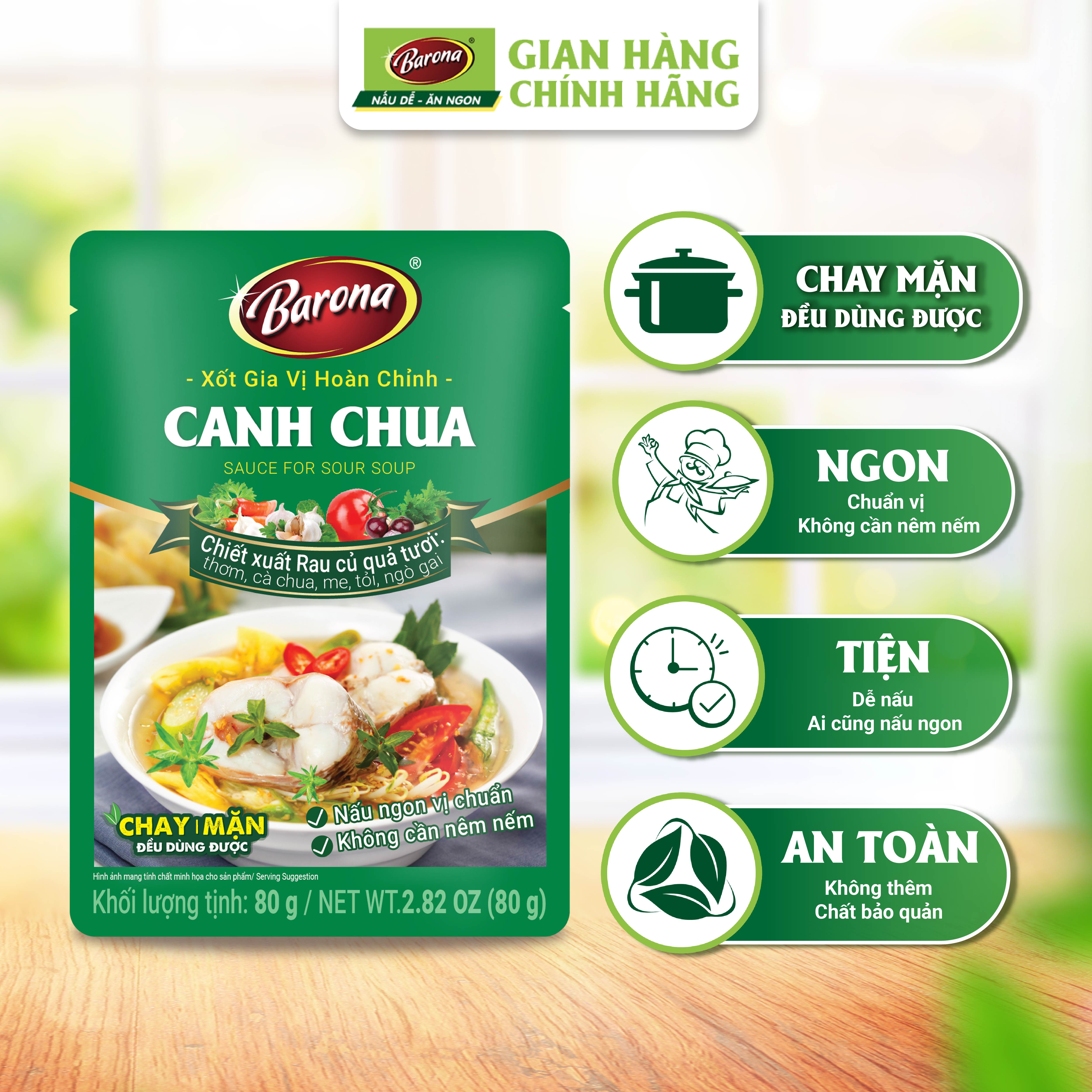 Xốt Gia Vị Hoàn Chỉnh Barona Canh Chua còn dùng để chế biến món Canh Chua, Lẩu Chua Cay, Canh Chua Măng mà không cần nêm nếm thêm bất kỳ gia vị nào khác.