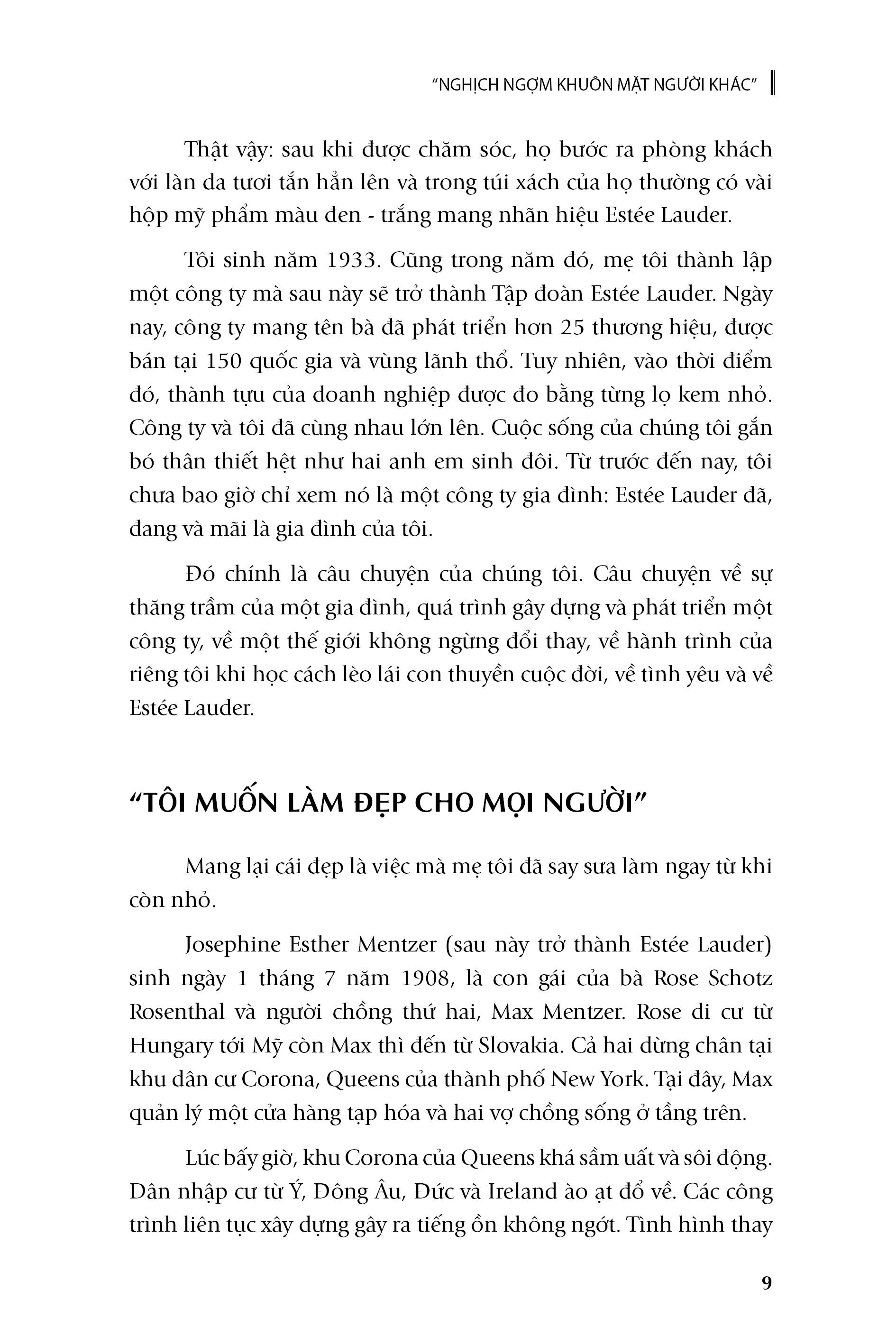 Trích chương 23: “Được một tay mẹ tôi - bà Estée Lauder nuôi nấng, làm sao tôi có thể không tôn trọng và trọng dụng những người phụ nữ thông minh, mạnh mẽ? Chính những phụ nữ mạnh mẽ đã đưa ra các quyết định sáng suốt nhất cho công ty này. Thế mạnh độc đáo của Estée Lauder chính là ngay từ khi mới thành lập, đã có một người phụ nữ đích thân sản xuất mỹ phẩm dành cho các chị em và thấu hiểu cách làm thế nào để khiến họ trở nên xinh đẹp và tự tin vào vẻ đẹp của mình.”