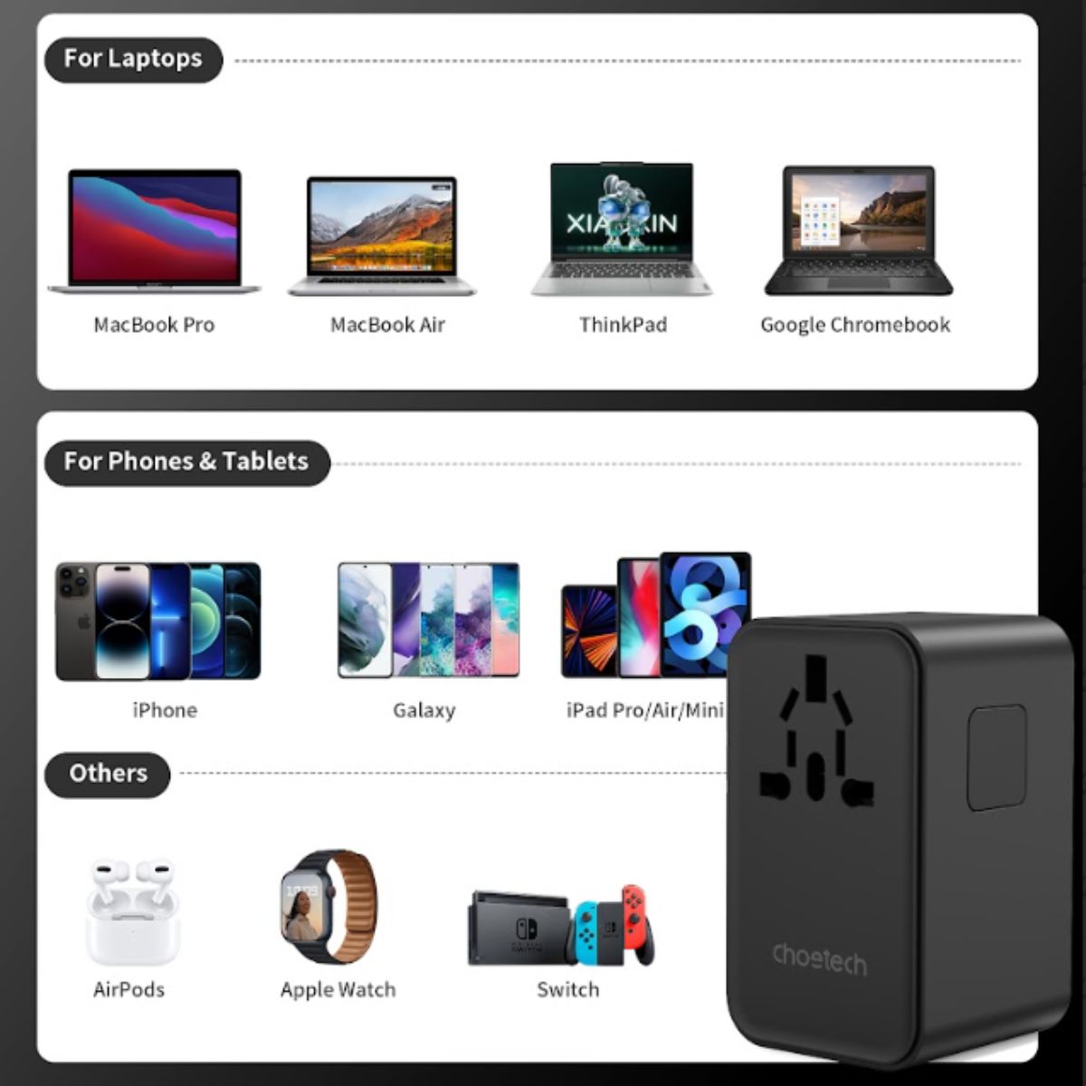 Giới thiệu Củ sạc Choetech PD5020 du lịch đa năng tích hợp thêm dây cáp sạc Type C (35W)/ PD5021 (45W)/ PD5022 (70W)- Hàng chính hãng - Thương hiệu: Choetech - Tính năng: Tích hợp 4 chuẩn