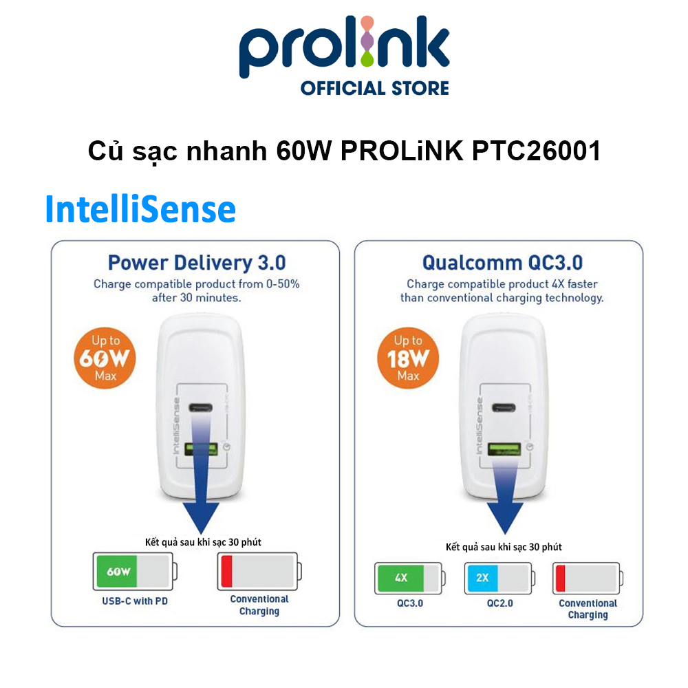 ️ Củ sạc PROLiNK PTC26001 60W: với IntelliSense đi kèm với 2 cổng sạc, cho phép người dùng sạc cùng lúc 2 thiết bị với công suất sạc kết hợp là 60W.