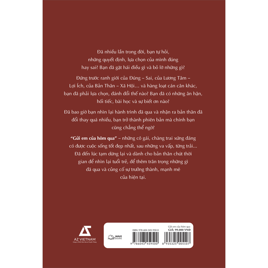 Đã nhiều lần trong đời, bạn tự hỏi, những quyết định, lựa chọn của mình đúng hay sai? Bạn đã gặt hái điều gì và bỏ lỡ những gì? Đứng trước ranh giới của Đúng – Sai, của Lương Tâm – Lợi Ích, của Bản Thân – Xã Hội… và hàng loạt cán cân khác, bạn đã phải lựa chọn, đánh đổi thế nào? Bạn đã có những ân hận, hối tiếc, bài học và sự biết ơn nào? Đã bao giờ bạn nhìn lại hành trình đã qua và nhận ra bản thân đã đổi thay quá nhiều, bạn trở thành phiên bản mà chính bạn cũng chẳng thể ngờ? “Gửi em của hôm qua” là những giây phút, những thước phim quay chậm về một thời tuổi trẻ mà Gari “tua” lại bằng con chữ. Cuốn sách mời gọi bạn cùng nhìn lại một chặng đường, mà trên đó bạn phải trải qua nhiều thử thách, va vấp lẫn thay đổi trong vòng xoay của mưu sinh, tình yêu, đam mê, và sự nghiệp. Dẫu có thế nào, cũng mong bạn có thể bao dung, trân trọng những điều của hôm qua. Hãy cho phép bản thân được bước qua sai lầm tuổi trẻ và dang tay chào đón hiện tại. Hãy sống thật rạng rỡ và trọn vẹn, để xứng đáng với Món Quà Cuộc Đời mà Ông Trời ban tặng. “Gửi em của hôm qua” là cuốn sách thứ 11 của nữ tác giả 9x tài năng Gari với châm ngôn sống: “Dù cuộc sống có vần xoay thế nào, hãy sống thật tử tế”. Sách được phát hành bởi thương hiệu sách Wavebooks với sứ mệnh trở thành người bạn đồng hành tin cậy cho quá trình phát triển kỹ năng và tâm hồn người Việt trẻ.