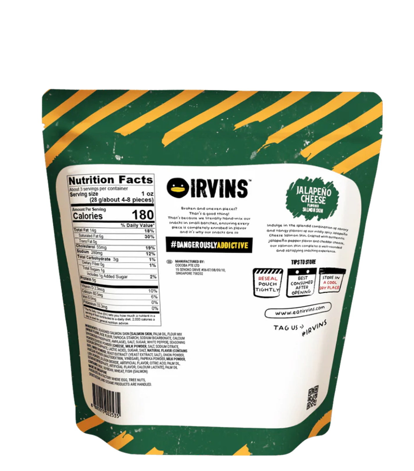 JALAPENO! BÙNG CHÁY HƯƠNG VỊ MỚI HOT NHẤT MÙA NÀY TỪ IRVINS! Thưởng thức sự kết hợp táo bạo của hương vị với da cá hồi phô mai Jalapeno IRVINS. Được chế biến từ da