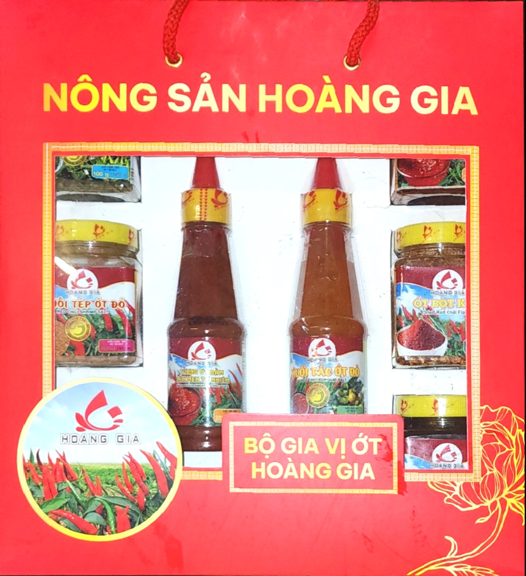 Bộ gia vị ớt Hoàng Gia bao gồm: - Ớt xiêm xanh ngâm giấm tỏi - 200g - Muối tép ớt đỏ - 100g - Muối ớt xanh - 100g - Tương ớt bằm lên