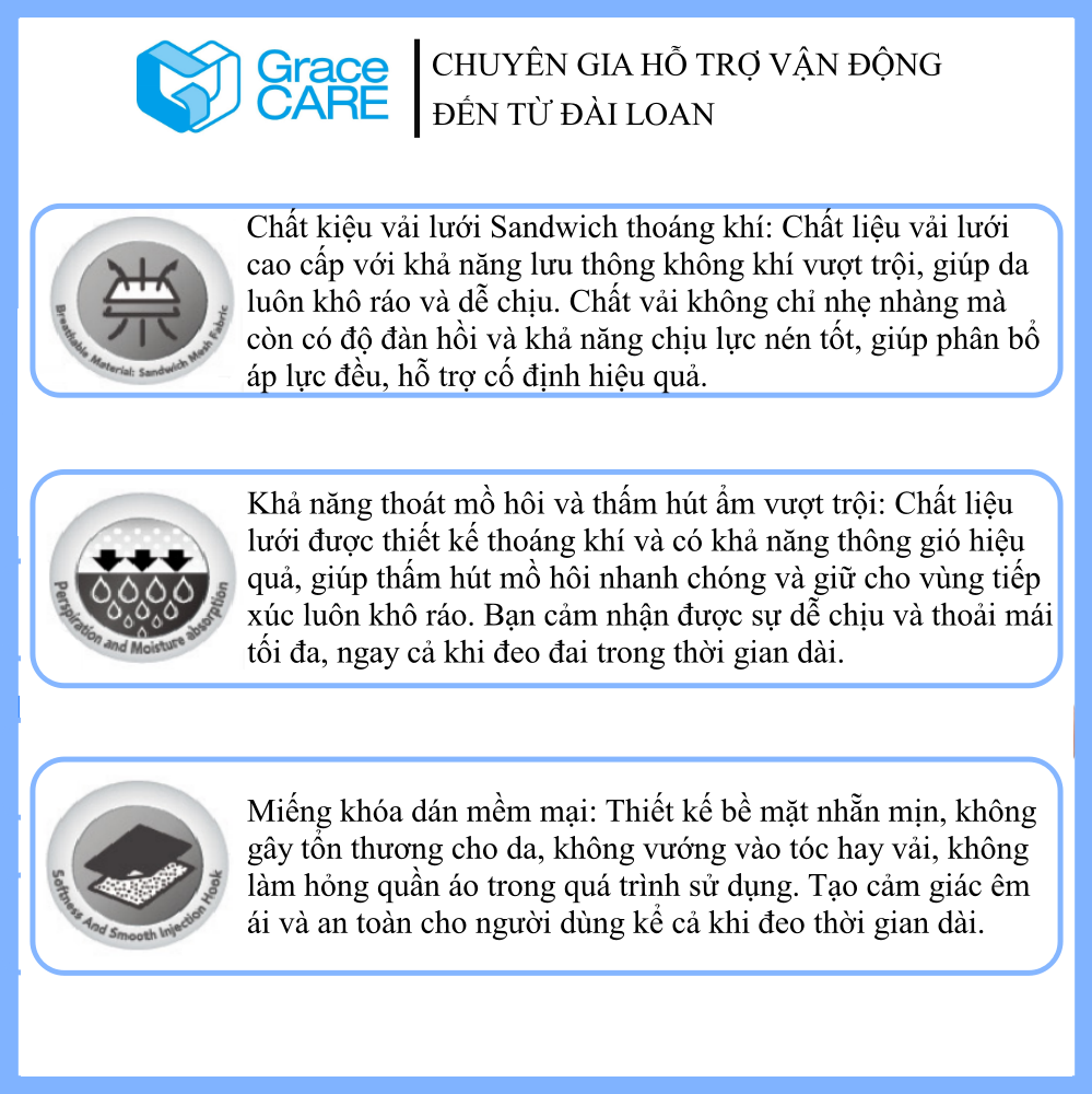 Thương hiệu: Grace Care - Nhà cung cấp chuyên nghiệp các sản phẩm chỉnh hình, bảo hộ thể thao tại Đài Loan. Sản xuất: Đài Loan Sản phẩm đạt tiêu chuẩn y tế ISO 13485