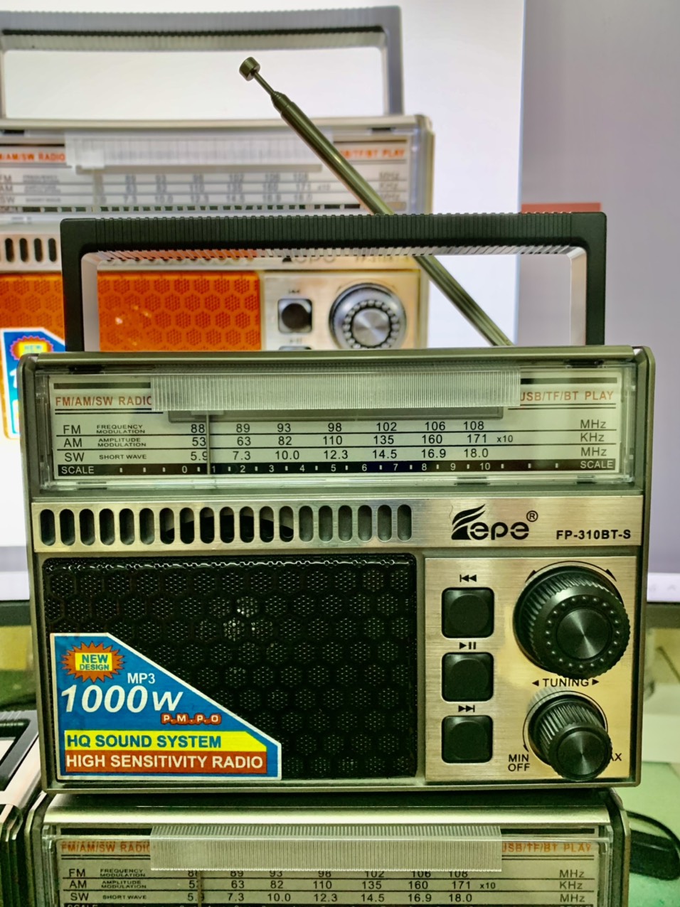 - Đài radio cho người già Fp-310BT có thể bắt được 3 băng tần AM, FM và SW. Bên cạnh đó, đài radio bluetooth còn sử dụng pin sạc 18650 (h2pro tặng kèm 1 quả pin), 2 pin đại AA siêu tiết kiệm hoặc cắm điện lưới 220V trực tiếp như các thiết bị thông thường khác, thuận tiện cho việc dò đài. - Đài radio nghe nhạc Fepe là dòng máy nghe nhạc cao cấp, ngoài các tính năng cơ bản của đài radio mini thì máy radio này còn có thêm tính năng bluetooth, nghe nhạc mp3 không cần thẻ nhớ, giúp kết nối với các thiết bị âm thanh khác được nhanh chóng và thuận tiện hơn. Ngoài ra, đài nghe nhạc Fepe Fp-310BT còn tích hợp jack cắm USB, Thẻ nhớ thông dụng. - Máy nghe nhạc bluetooth Fepe được thiết kế đặc biệt hơn các loại máy radio khác, với tích hợp tấm thu năng lượng mặt trời cao cấp, đài bluetooth mini có thể sạc pin ở cả những nơi không có điện lưới chạy, phù hợp với các nơi vùng sâu vùng xa, trên núi, hải đảo nơi điện áp không ổn định. * Đài radio bluetooth Fepe Fp-310BT có 3 màu: - Màu xanh - Màu đen - Màu đỏ