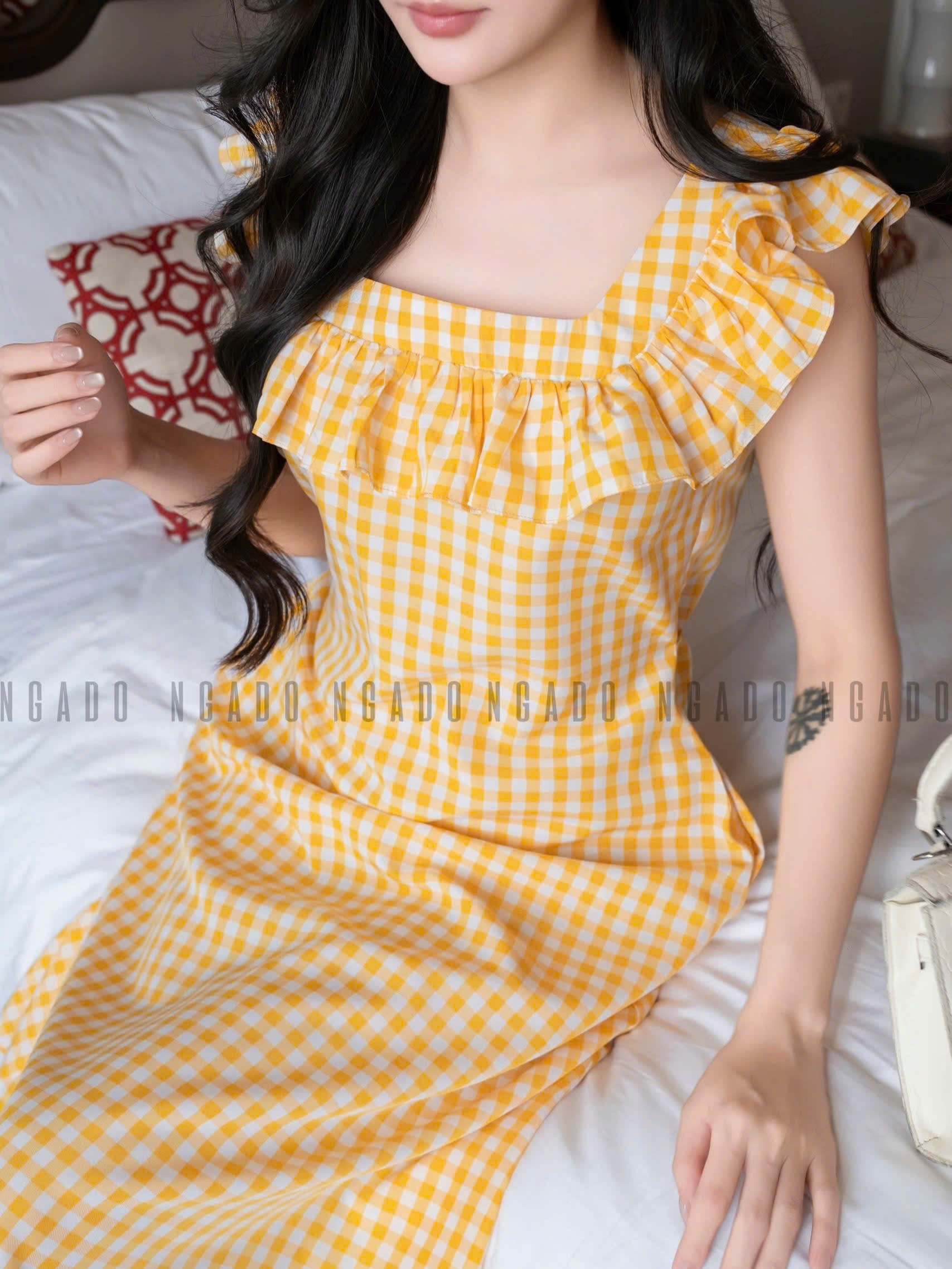 ✨Đầm caro vàng phối cổ nhún NGADO , đầm caro , đầm kẻ , đầm dạo phố