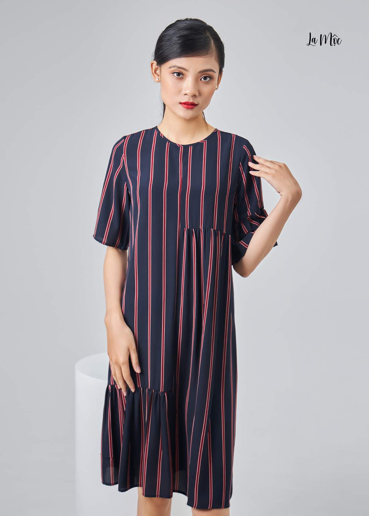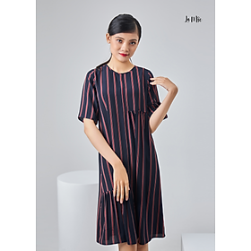 Mua tại TiktokĐầm lụa La Mộc cổ tròn, chất liệu lụa Korea, hoạ tiết sọc dọc tím trắng đỏ, cúp cách điệu nhún nhẹ phần chân váy và phần hông.