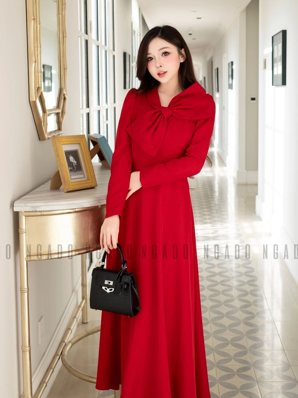 ✨Đầm đỏ cổ phối nơ NGADO , đầm dự tiệc dáng dài