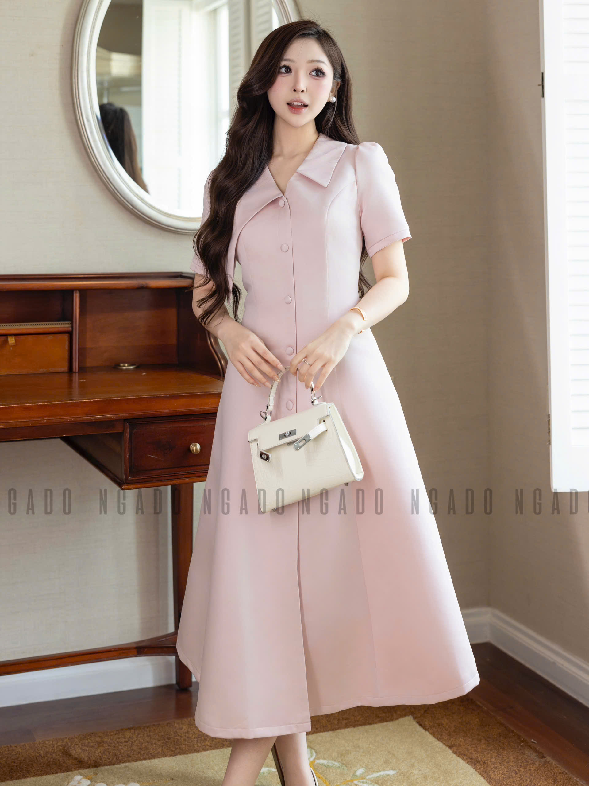 ✨Đầm hồng cổ vest NGADO , đầm công sở , dự tiệc