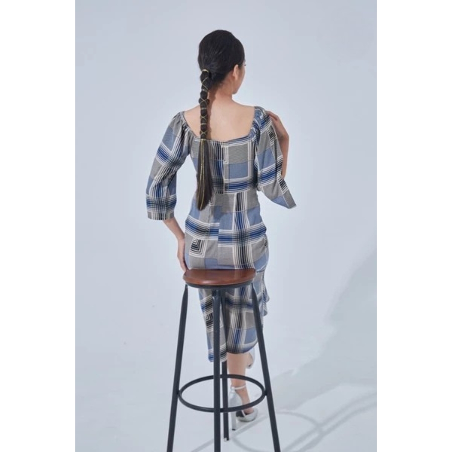 Mua tại TiktokĐầm lụa caro dáng ôm, cỗ chữ V, viền chun dài từ ngực đến hông, tay áo dài cách điệu xẻ.