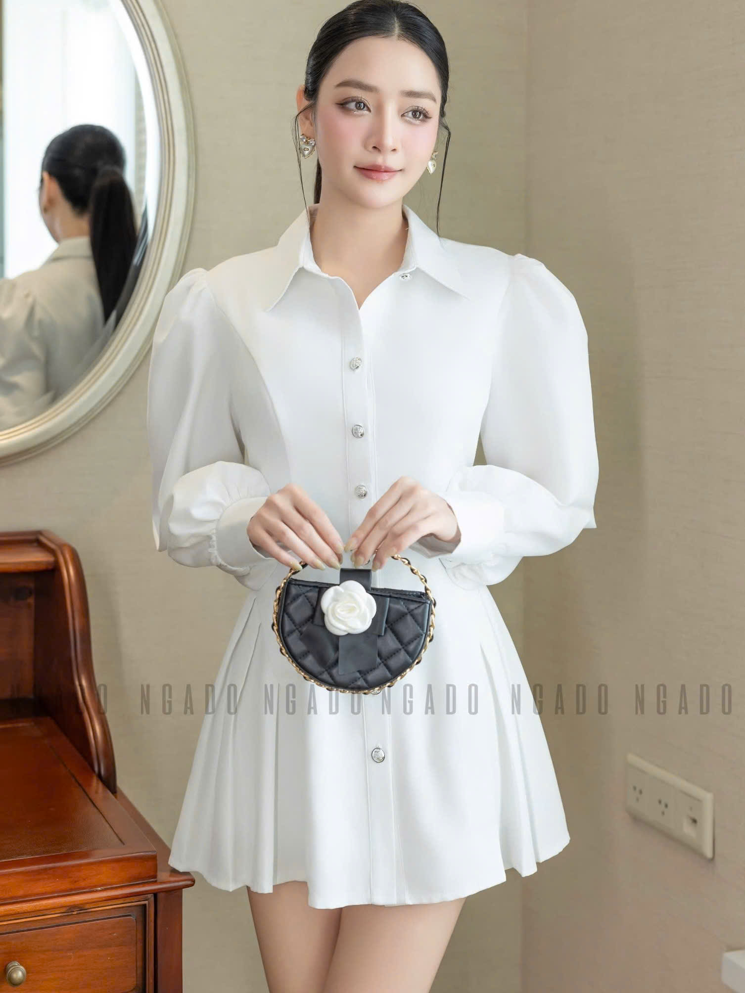 ✨Đầm trắng cổ sơ mi tay dài NGADO , đầm kiểu , đầm sơ mi