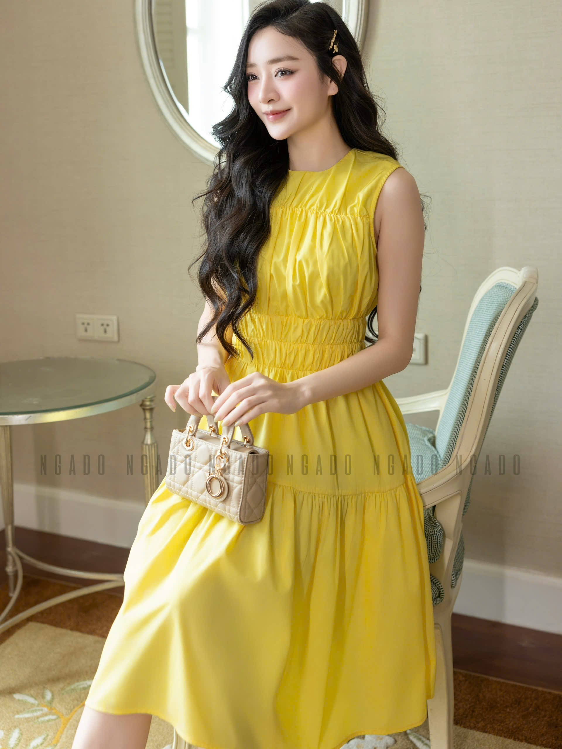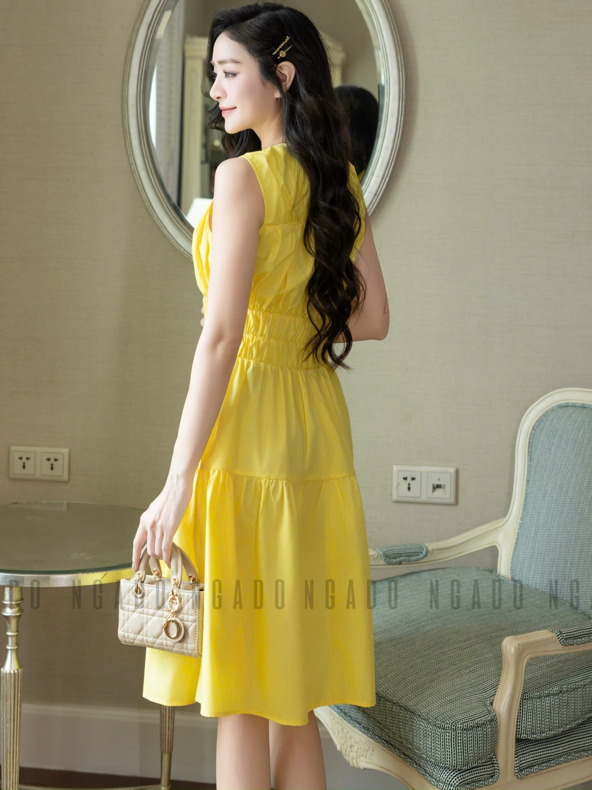 ✨Đầm vàng nhún eo NGADO , đầm dài , đầm sát nách , đầm kiểu Nữ