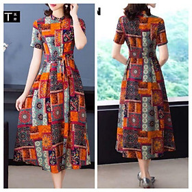 ĐẦM XOÈ HOẠ TIẾT HOA CỔ TRỤ Chất: lụa mango Màu: hoạ tiết như hình Kiểu dáng: đầm xoè cổ trụ, tay ngắn, cài nút trước ẩn, kèm dây thắt eo rời, dây kéo bên